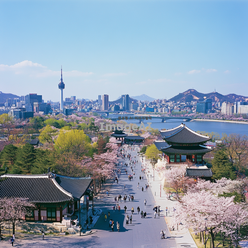 서울의 전경, 남산타워와 한강이 보이는 풍경, 현대적인 건물과 전통적인 한옥이 조화를 이루는 모습, 화창한 날씨, 사람들이 즐겁게 걷고 있는 거리, 봄철 벚꽃이 만개한 모습, 한국의 전통 문화와 현대적인 도시 생활이 어우러진 장면