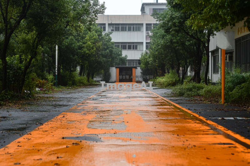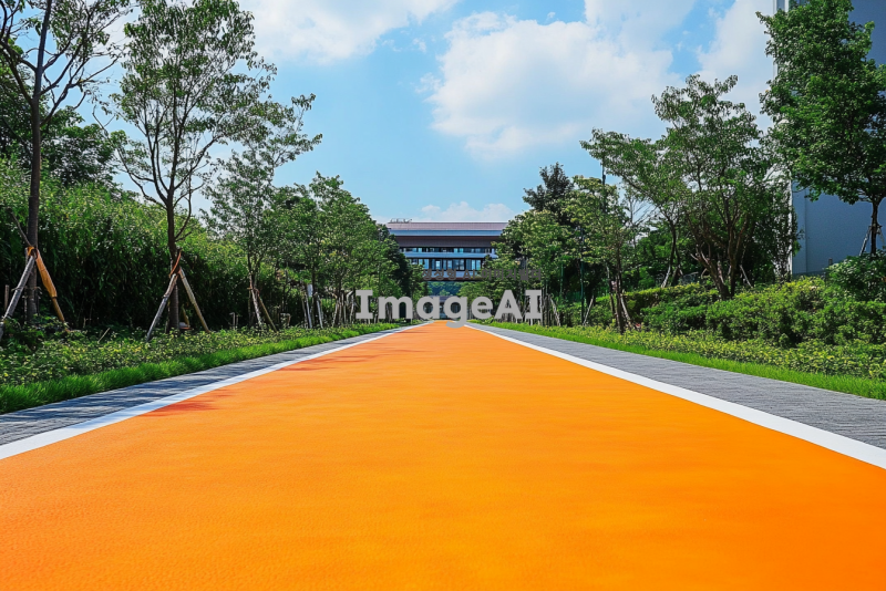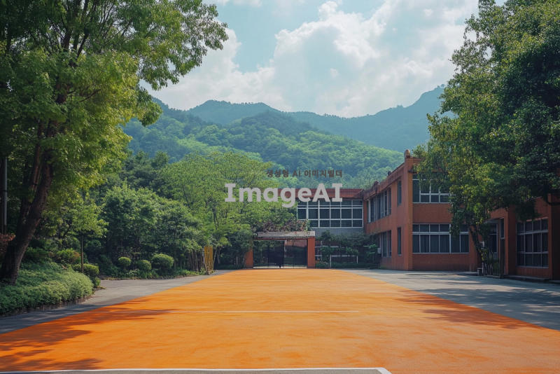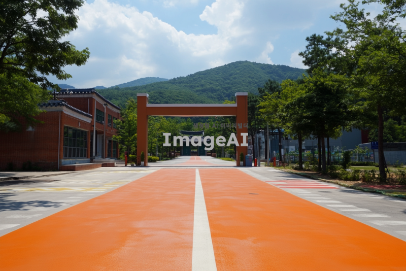 안화고등학교 앞 정문에 안전사고를 고려한 주황색 페인트로 칠해진 스쿨로드를 그려줘