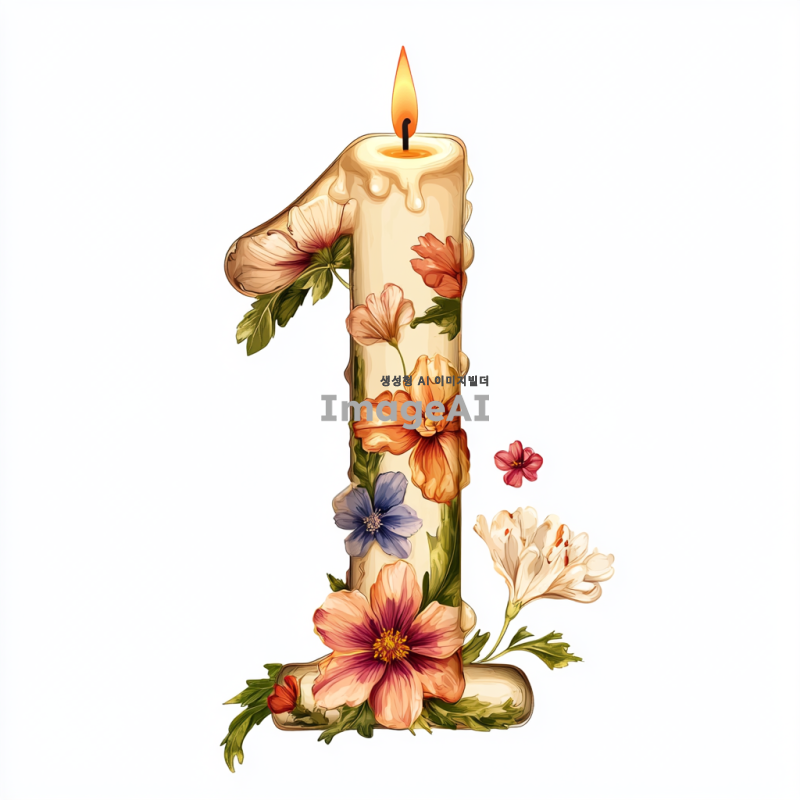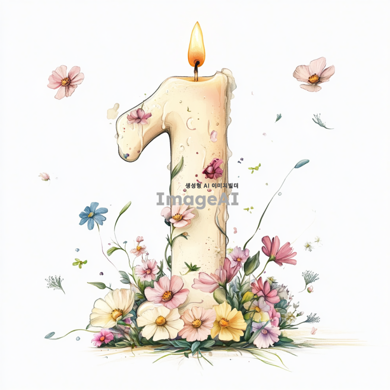 숫자 1 위에 촛불이 켜져 있고 주위에 꽃이 날리는 일러스트 이미지. 전체 배경은 흰색으로