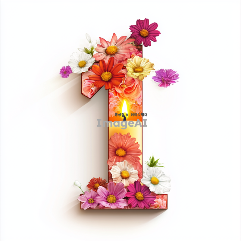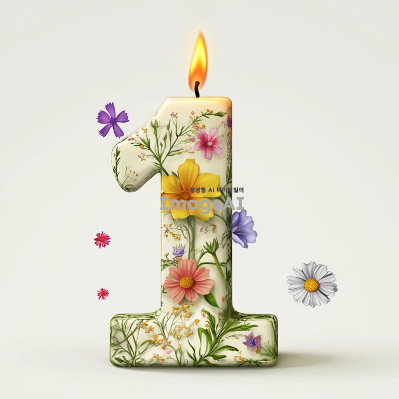 숫자 1 위에 촛불이 켜져 있는 모습, 주위에 꽃들이 날리는 장면을 담은 일러스트. 배경은 깨끗한 흰색으로 설정.