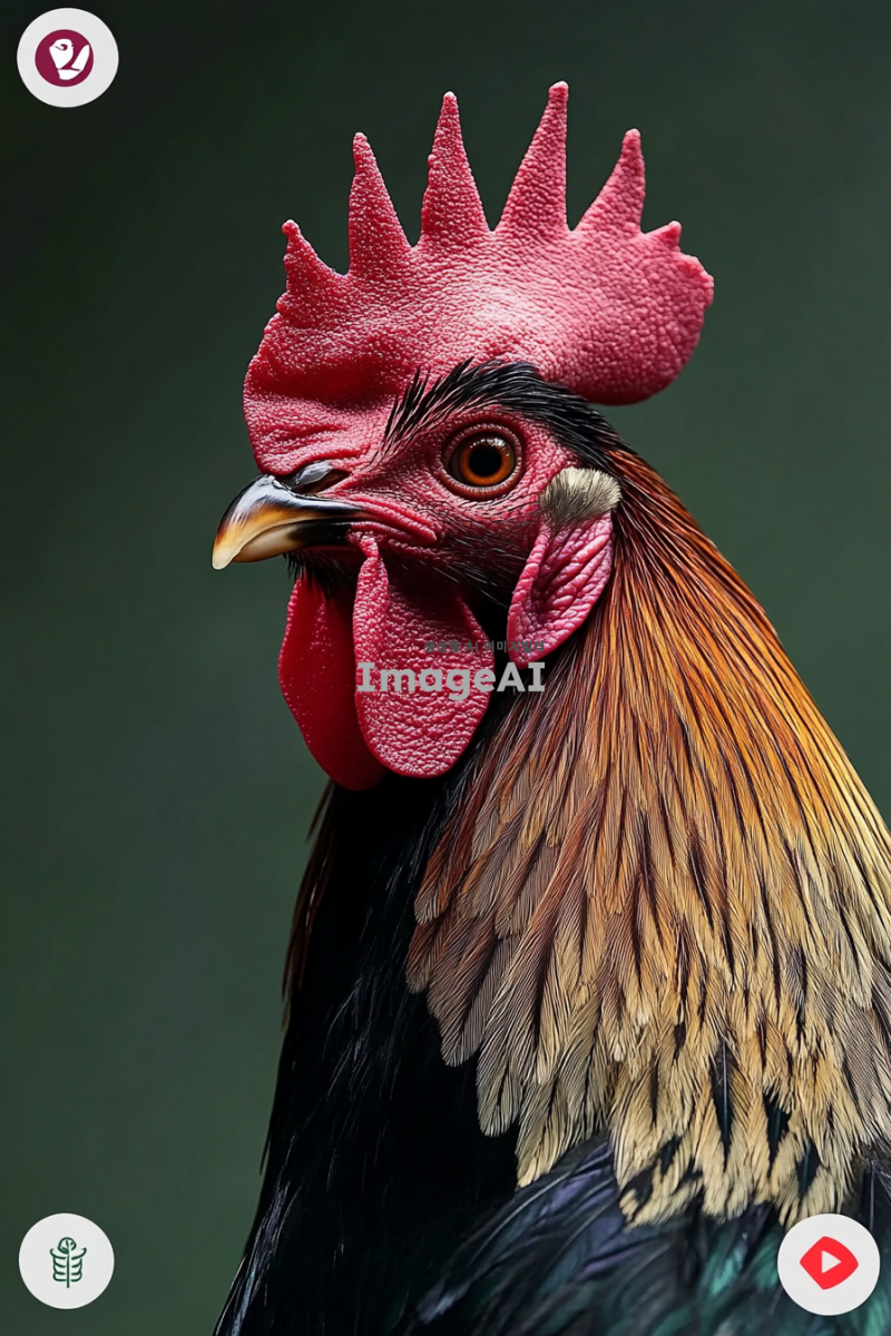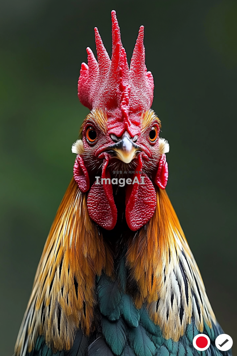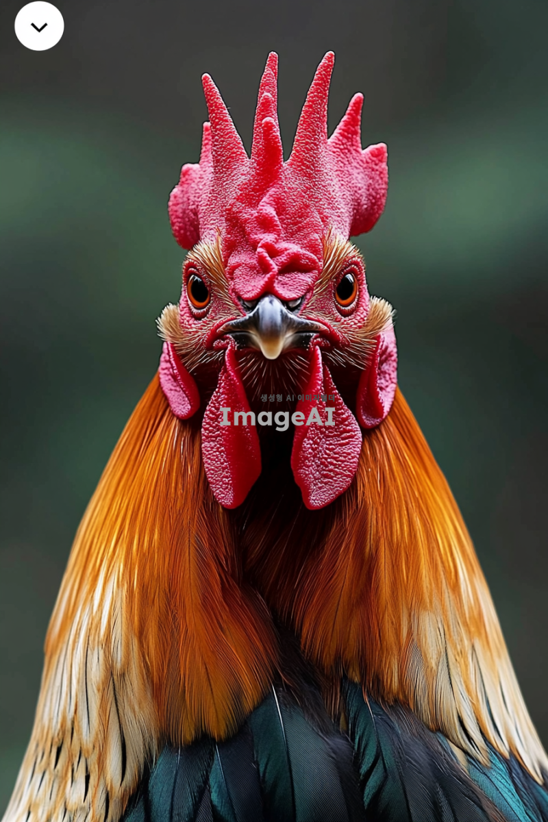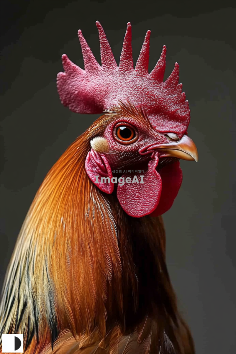 카리스마 넘치는 대한민국 토종닭 수탉의 얼굴을 핀조명으로 강조하여 타이트하게 촬영한 이미지. 수탉의 선명한 깃털과 강렬한 눈빛이 돋보이도록 하며, 배경은 흐릿하게 처리하여 수탉에 집중할 수 있도록 구성.