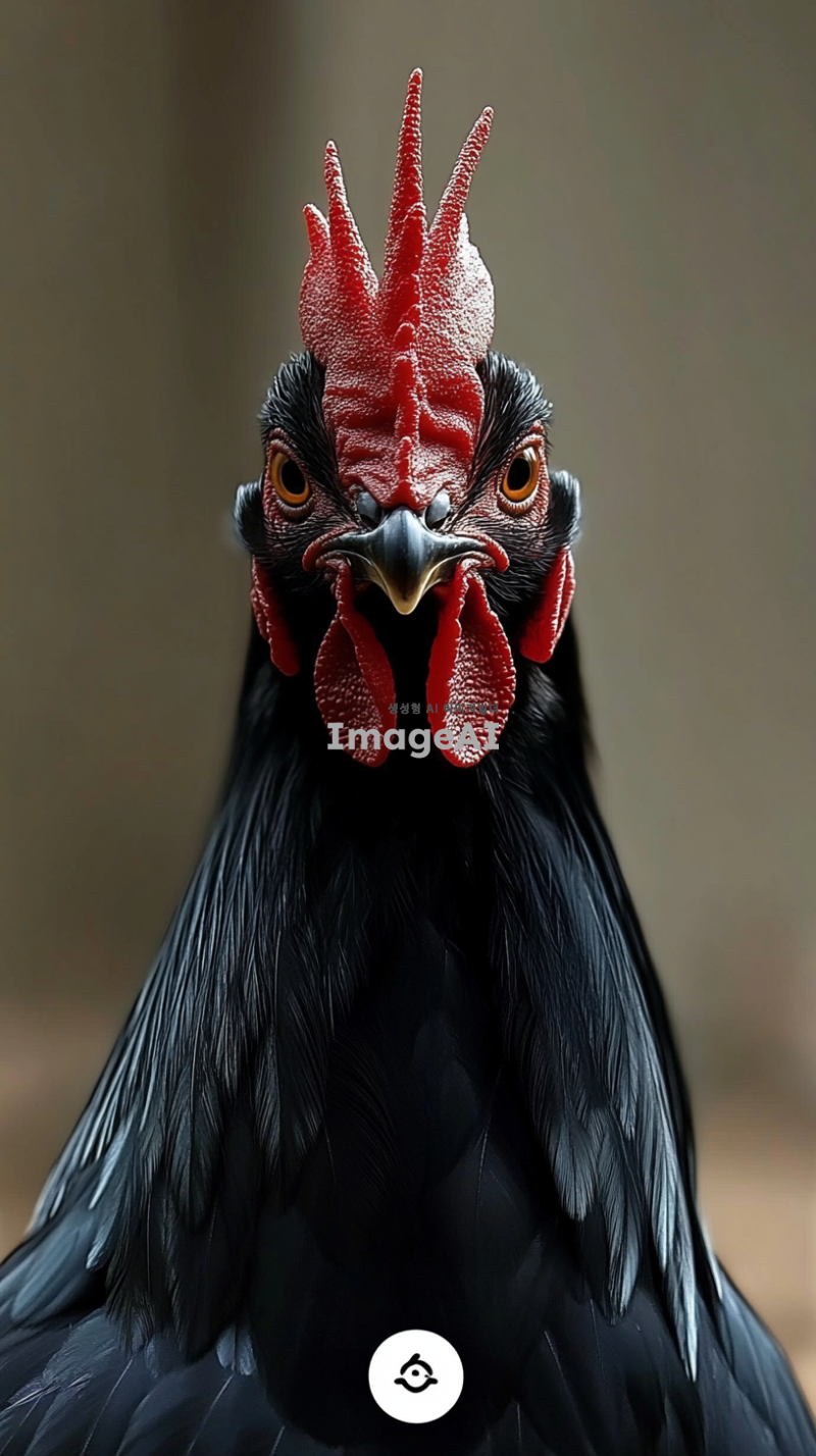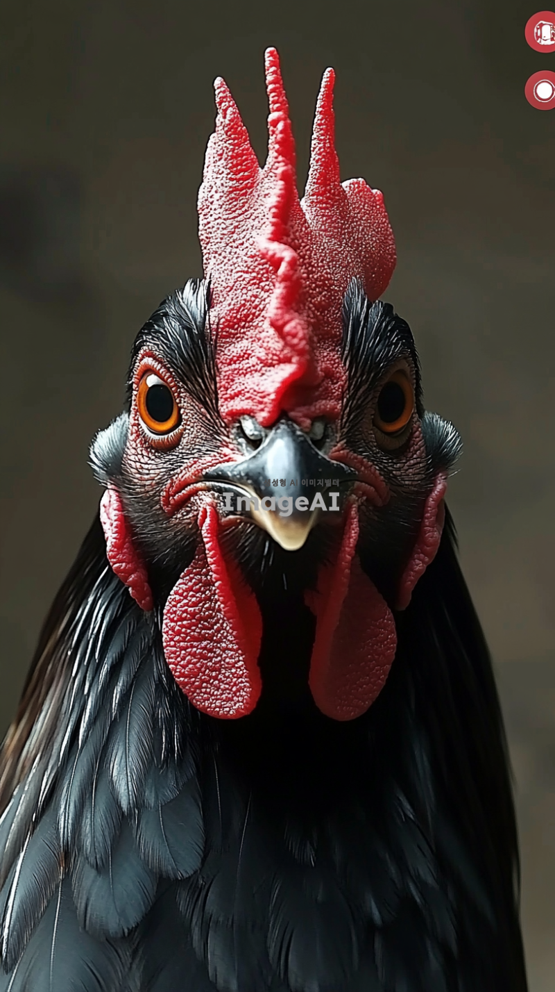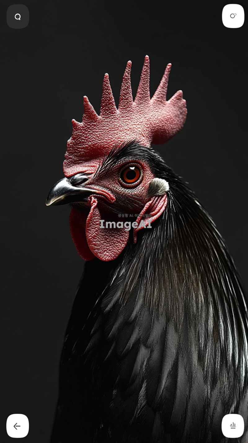 카리스마 넘치는 대한민국 토종닭 수탉의 얼굴을 핀조명으로 강조하여 타이트하게 촬영한 이미지. 수탉의 선명한 검정색 깃털과 강렬한 눈빛이 돋보이도록 하며, 배경은 들판이나 흐릿하게 처리하여 수탉에 집중할 수 있도록 구성.