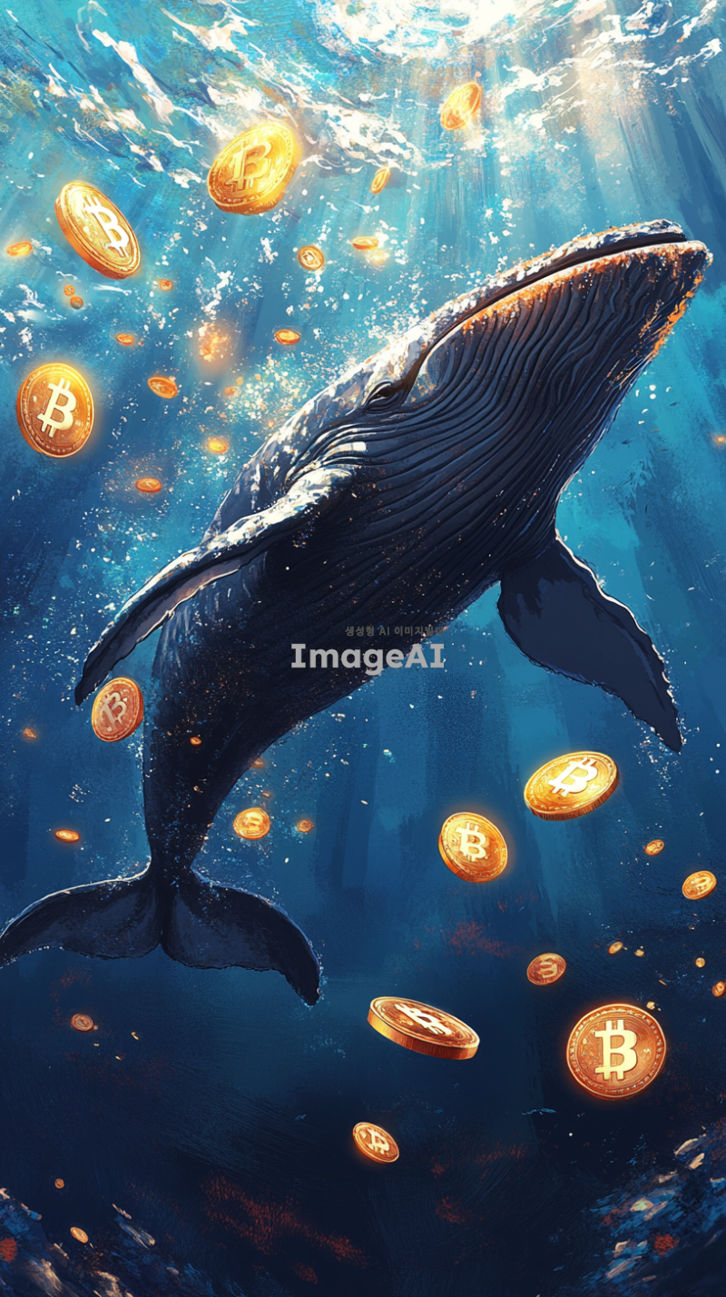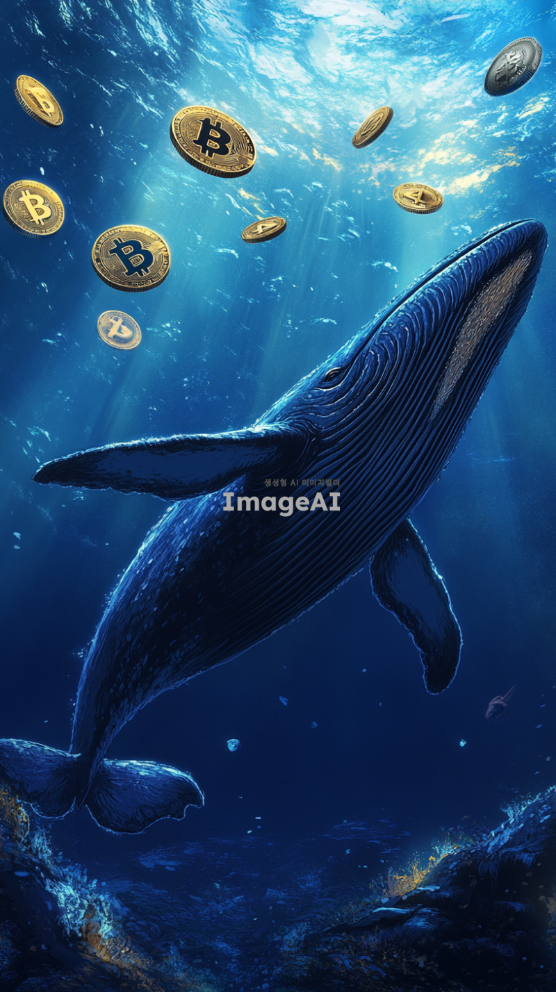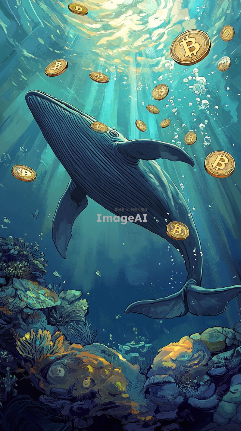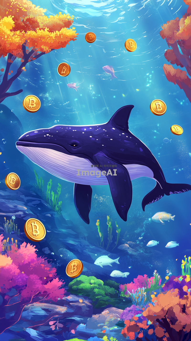 고래 옆에 리플코인이 명확하게 보이는 장면, 바다 속에서 고래가 헤엄치고 있고 그 주위에 여러 개의 리플코인이 떠 있는 모습, 생동감 있는 색감과 디테일이 강조된 일러스트, 한국의 바다를 배경으로 한 환상적인 분위기.