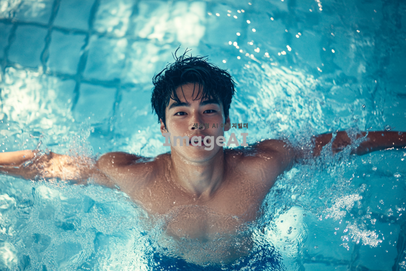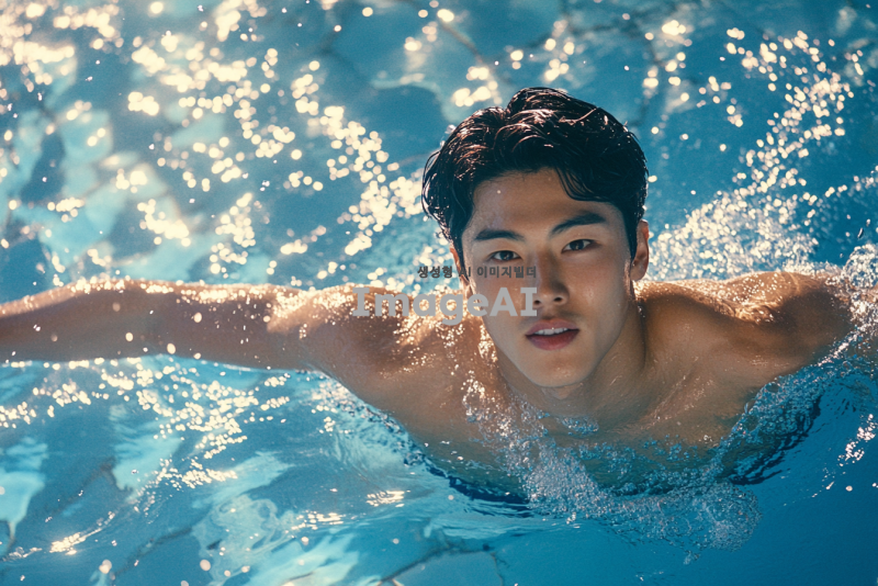수영장에서 자유형으로 수영하는 한국인 남성, 물이 튀기는 역동적인 순간, 수영복을 입고 힘차게 팔을 저으며 앞으로 나아가는 모습, 수영장 바닥의 블루 타일과 수면 위의 반사된 빛, 생동감 넘치는 표정과 집중한 눈빛, 여름의 따뜻한 햇살이 비치는 장면.
