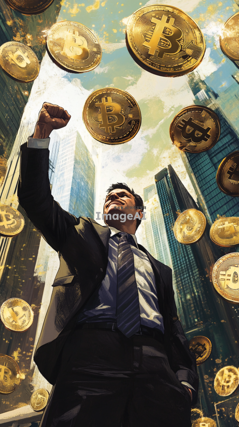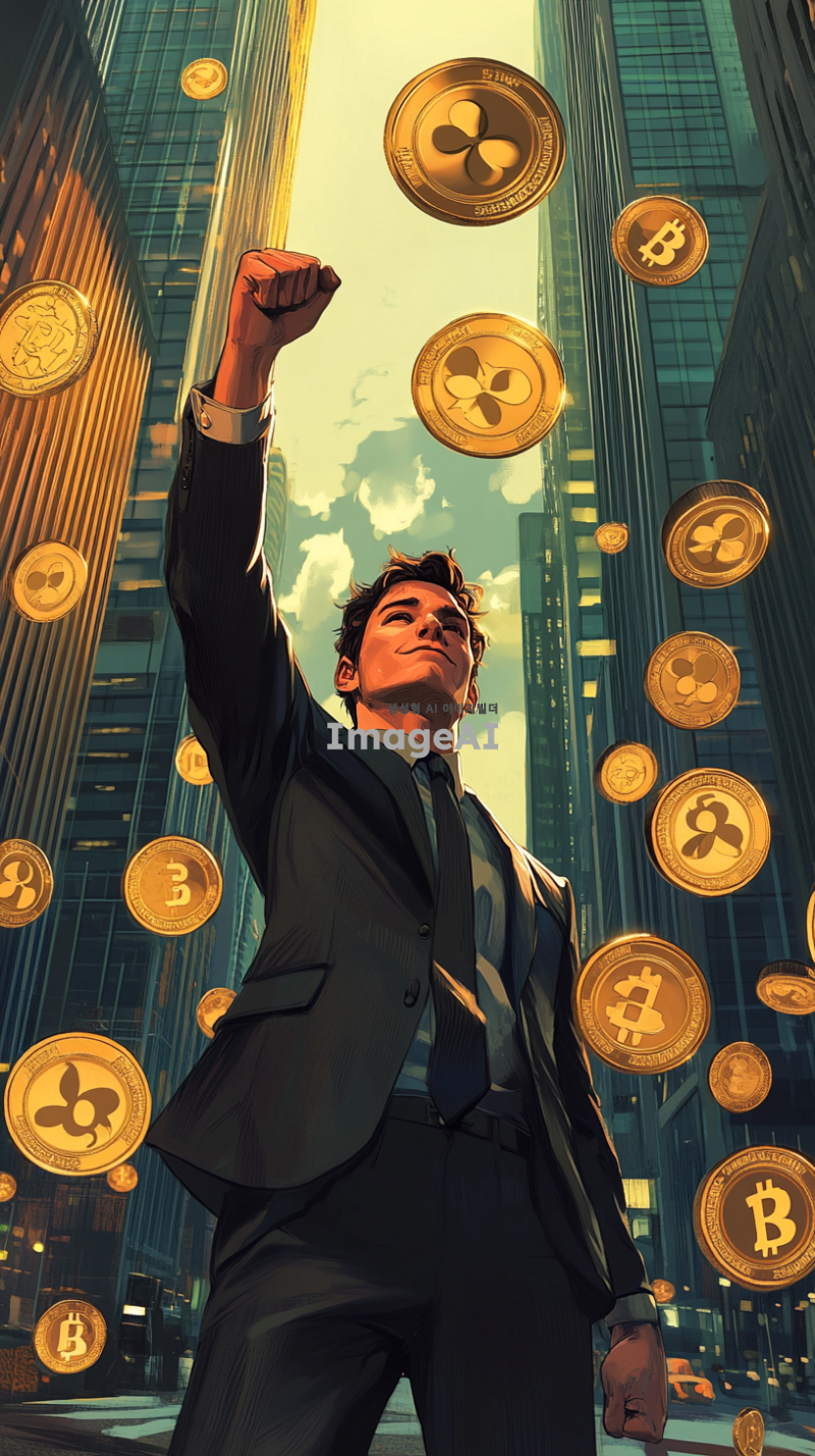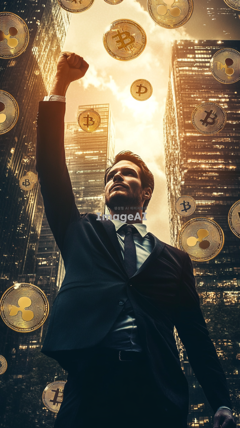 정장 입은 남자가 한 팔을 들고 있으며, 올린 팔은 주먹을 쥐고 있는 모습. 주위에는 리플코인이 많이 배치되어 있는 장면. 배경은 현대적인 도시 풍경으로, 트럼프의 표정은 자신감 넘치는 모습.