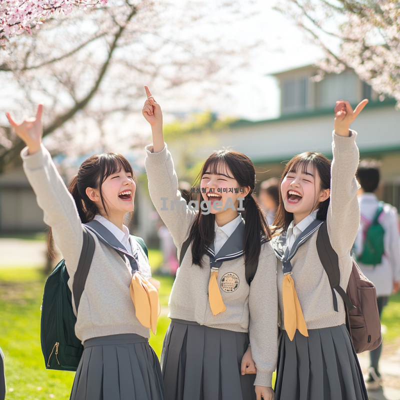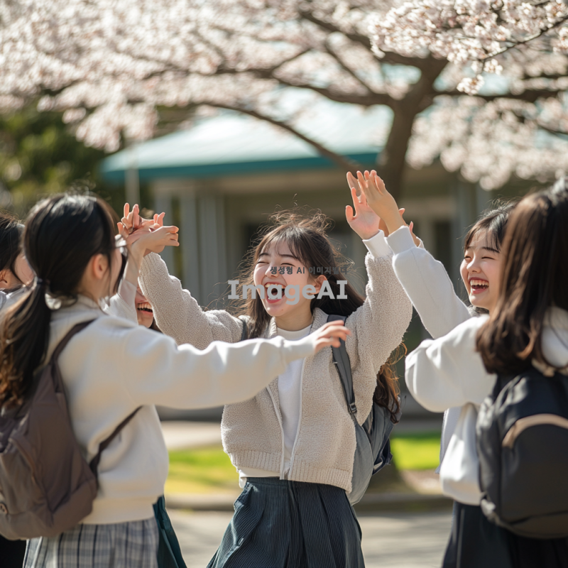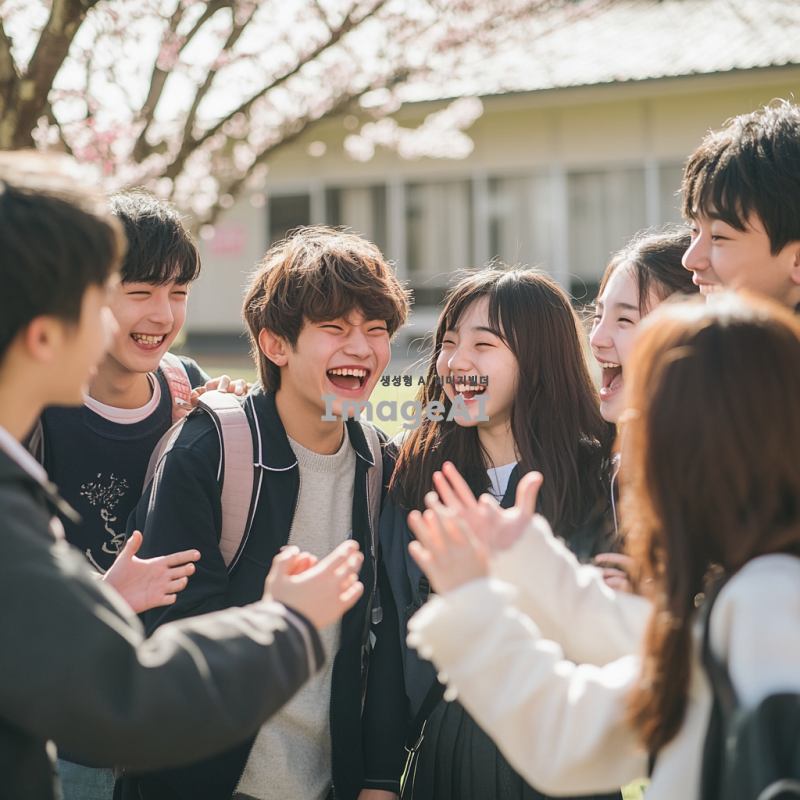 고등학교 1학년을 마무리하는 학생들이 서로를 격려하며 웃고 있는 모습. 따뜻한 햇살 아래, 교실 앞에서 친구들과 함께 기념사진을 찍는 장면. 학생들은 다양한 표정을 지으며 서로의 손을 맞잡고, 배경에는 학교의 푸른 잔디밭과 벚꽃이 만개한 나무가 보인다. 학생들의 옷차림은 자유롭고 편안하며, 서로에게 힘을 주는 듯한 따뜻한 분위기를 강조한다.