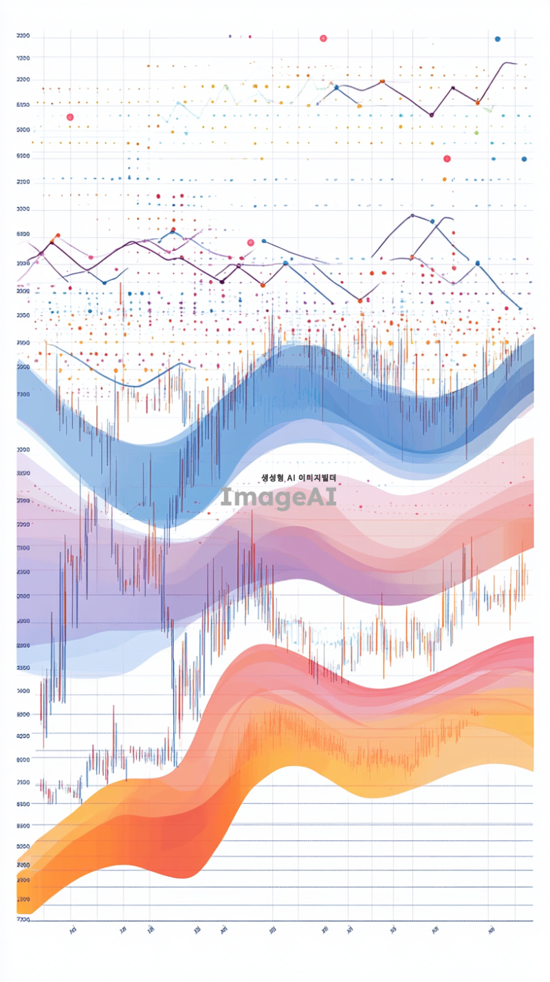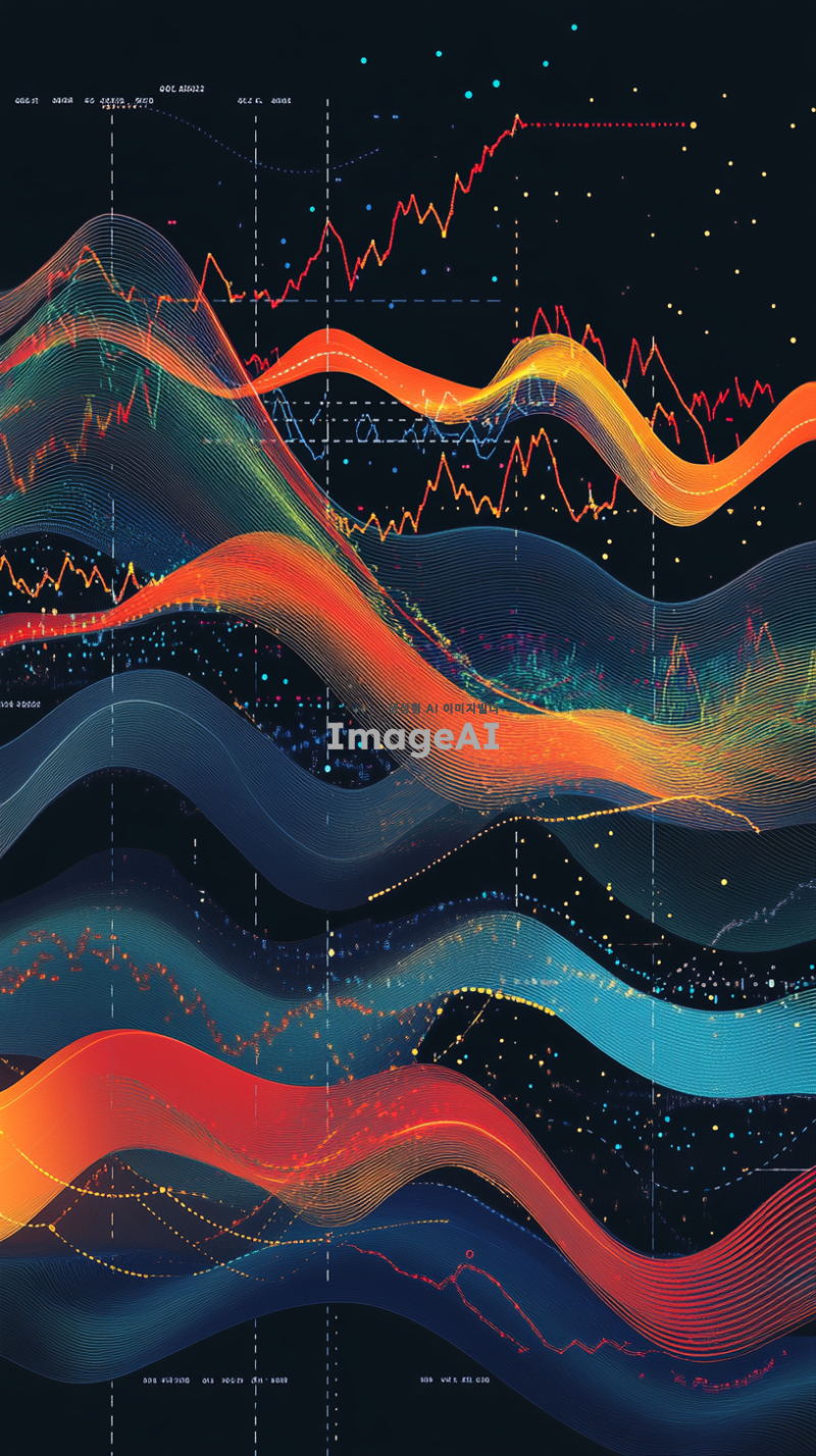횡보하는 리플 차트를 배경으로 한 이미지, 다양한 색상의 선들이 수평으로 움직이며 변동이 적은 모습을 표현, 차트의 축에는 숫자와 날짜가 표시되어 있고, 전체적인 분위기는 안정적이며 조용한 느낌, 현대적인 디자인 요소 추가, 금융 시장을 연상시키는 요소 포함
