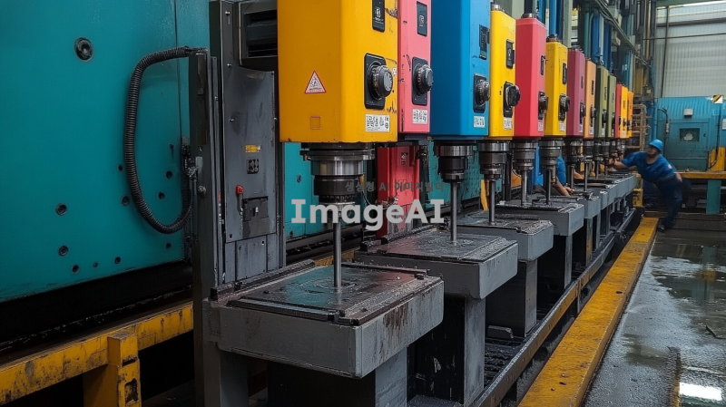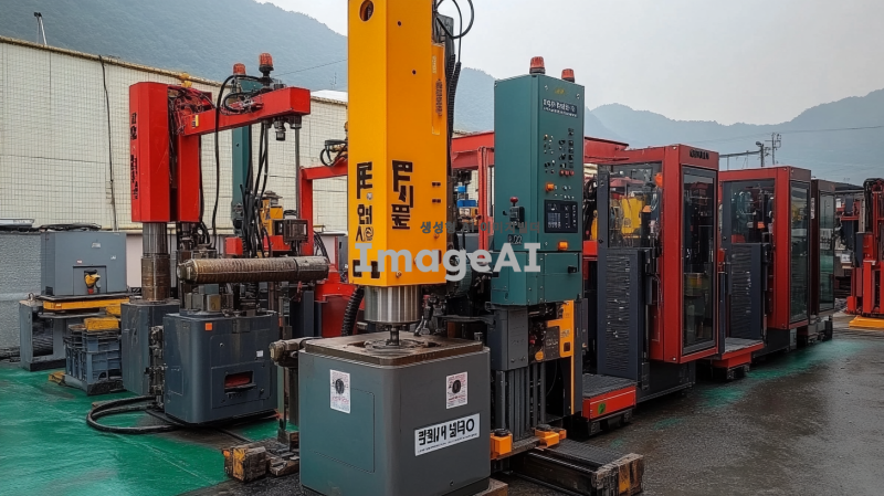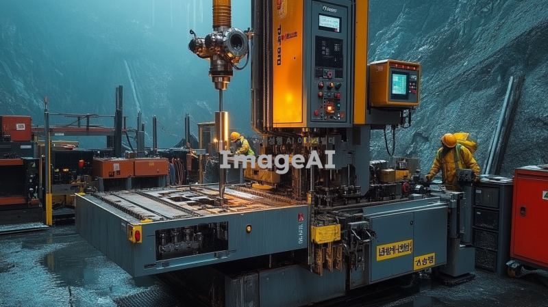 수퍼드릴을 배경으로 한 한국의 현대적인 작업 현장, 다양한 색상의 수퍼드릴이 정렬되어 있는 모습, 강력한 드릴의 디테일이 강조된 이미지, 작업자들이 드릴을 사용하고 있는 모습, 역동적인 분위기와 함께 기술적인 느낌이 나는 장면.