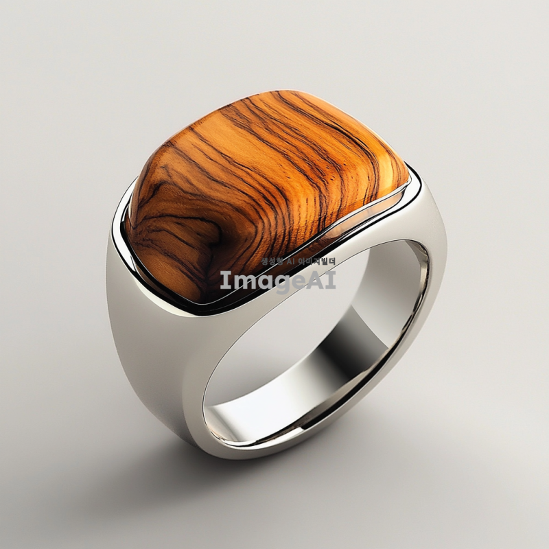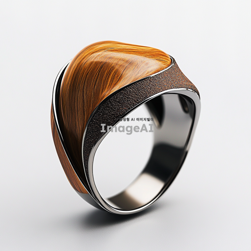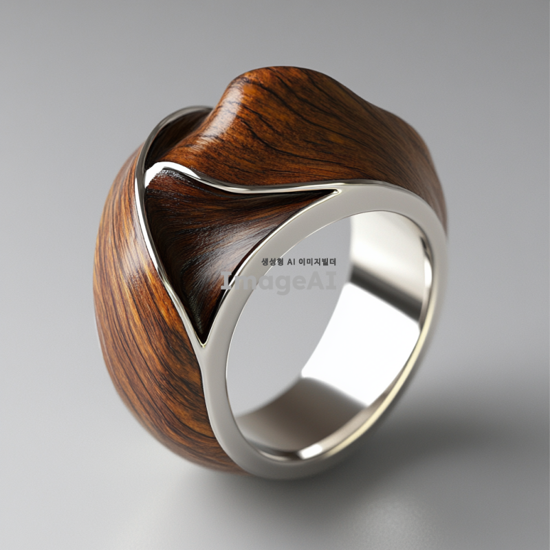 나무결을 강조한 아트주얼리 반지 디자인, 나무와 실버 소재를 사용하여 세련되고 독창적인 형태로 표현, 3D 렌더링, 자연적인 색감과 텍스처, 현대적인 느낌을 주는 스타일, 한국인 디자이너의 감각을 담은 작품.