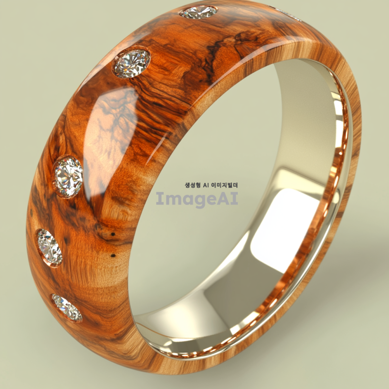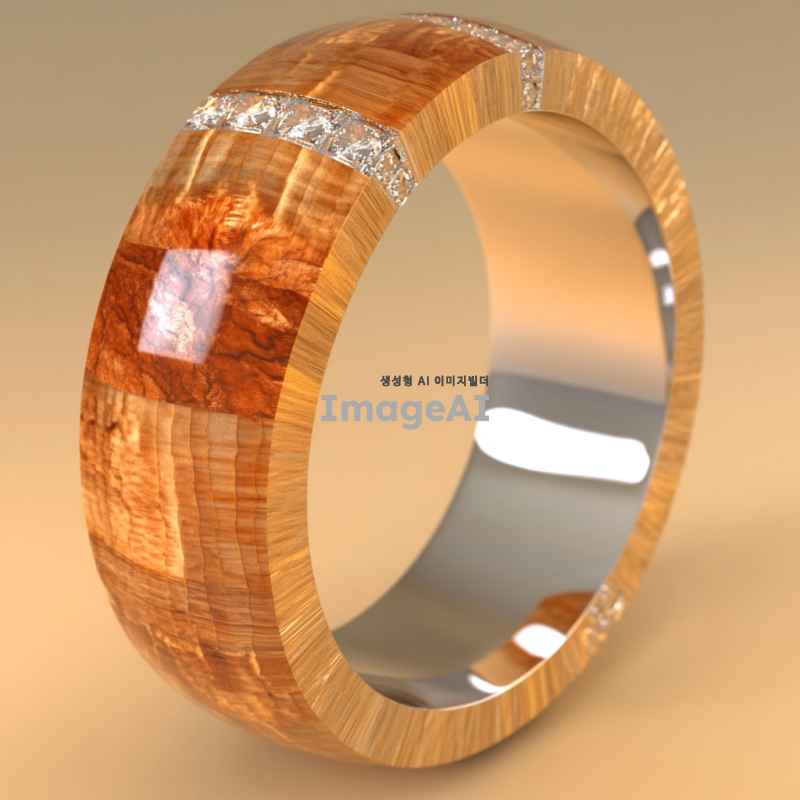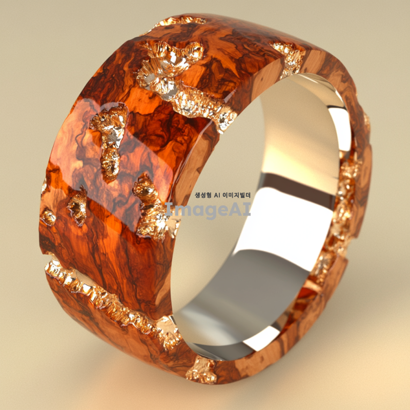나무결이 돋보이는 나무와 실버를 활용한 아트 주얼리 반지의 3D 디자인. 나무의 자연스러운 질감과 실버의 고급스러운 광택이 조화롭게 어우러진 형태로, 독특하고 세련된 느낌을 주는 반지. 세밀한 나무결과 실버의 디테일이 강조된 모습, 배경은 부드러운 톤으로 설정하여 반지의 아름다움이 더욱 부각되도록.