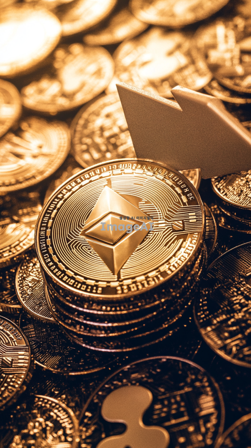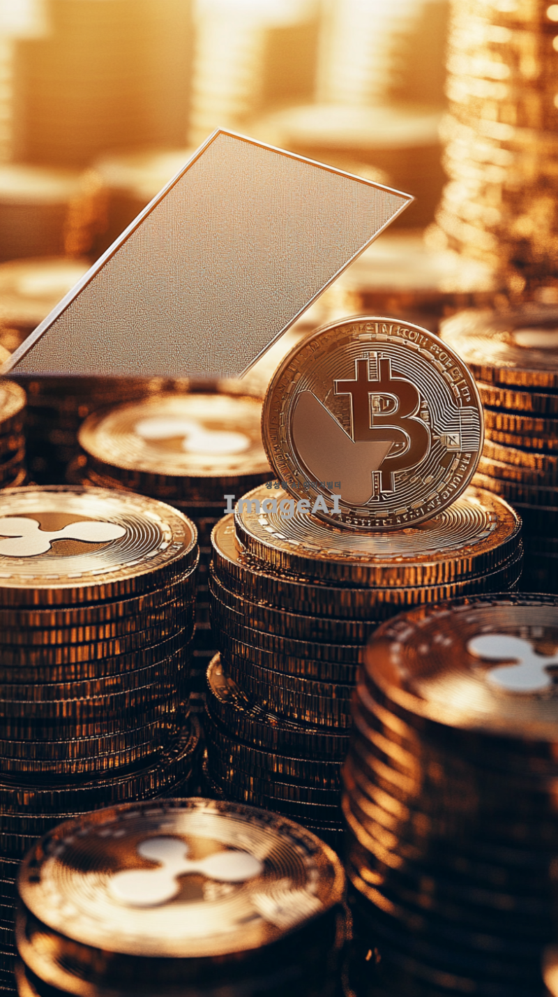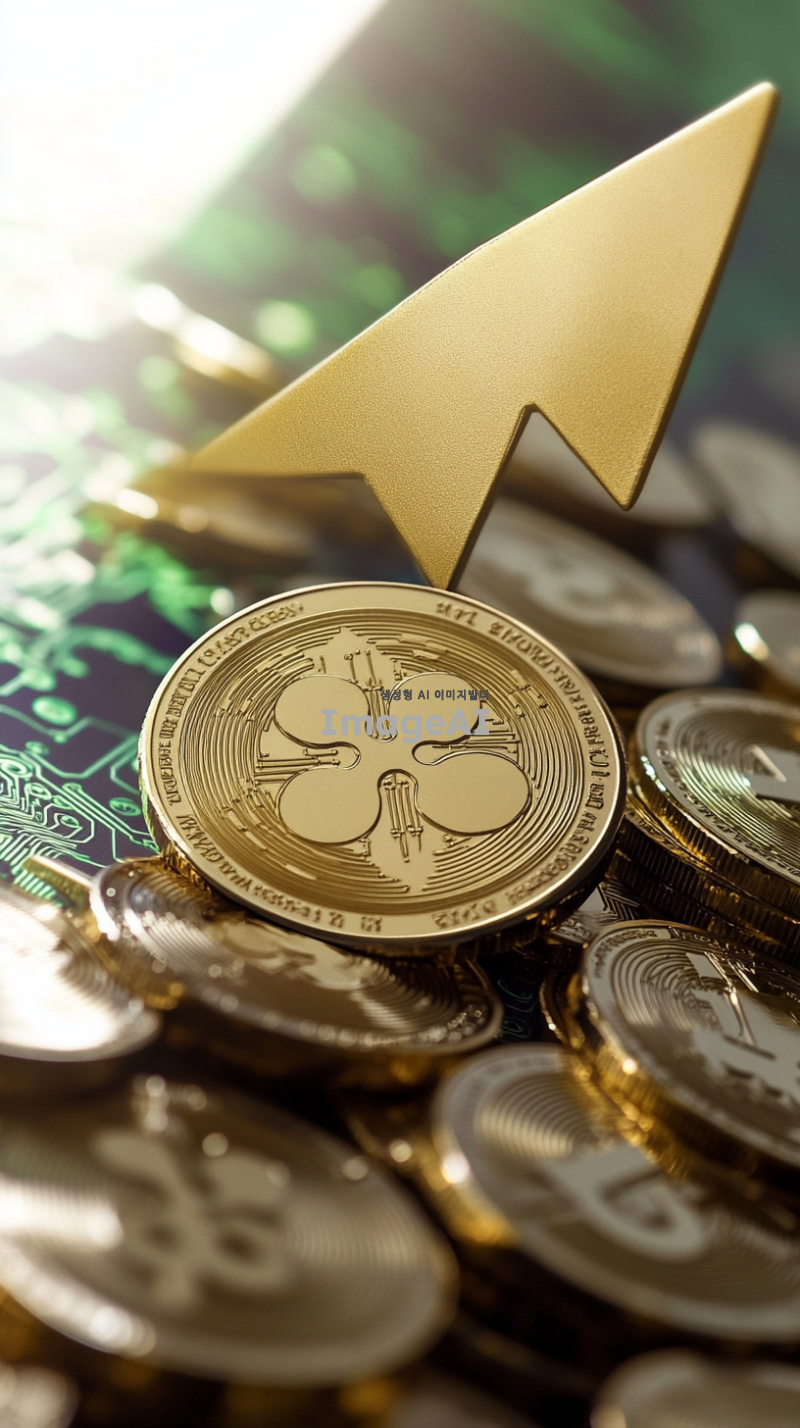 리플 코인이 화면을 가득 채우고 있으며, 상승을 나타내는 화살표가 함께 있는 이미지. 배경은 밝고 긍정적인 느낌을 주며, 리플 코인의 디테일이 잘 보이도록 강조. 화살표는 두껍고 선명하게 그려져 상승하는 방향으로 뻗어있음. 전체적으로 희망적이고 미래 지향적인 분위기를 전달하는 이미지.