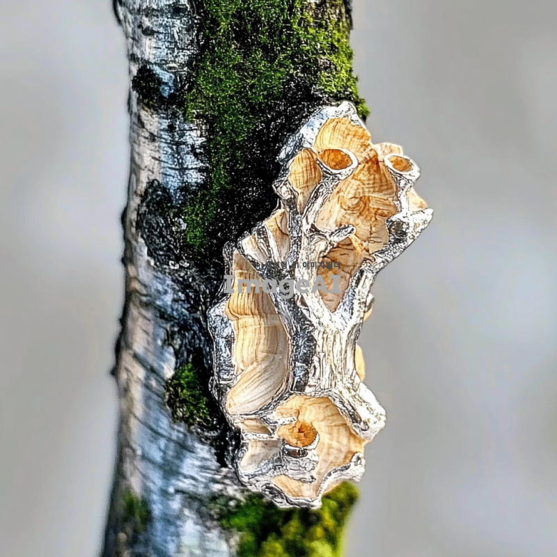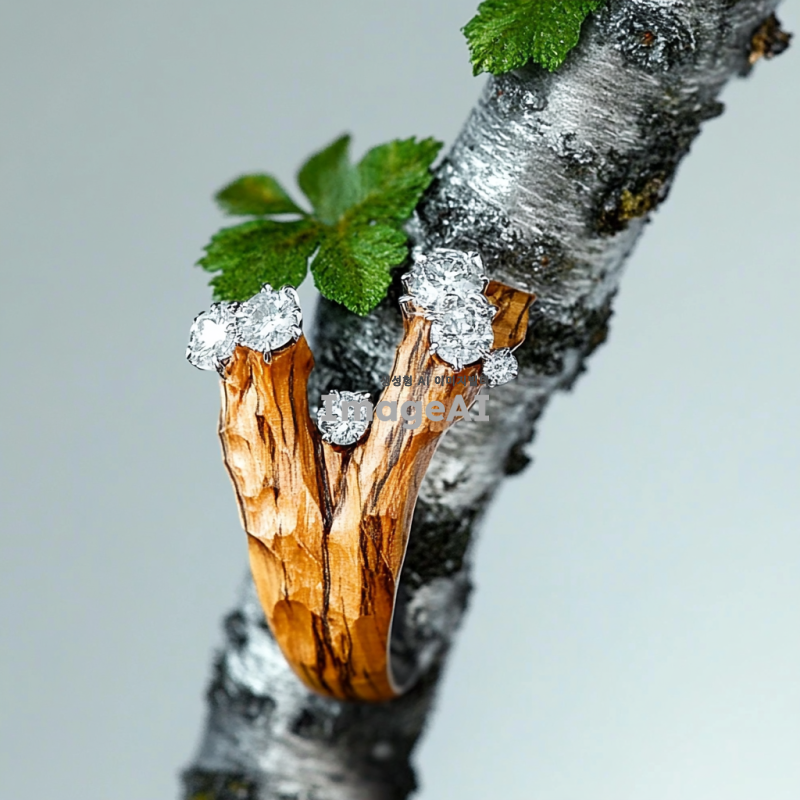 나무와 실버를 조화롭게 결합한 아트 주얼리 반지를 3D로 디자인한 이미지, 자연의 아름다움을 담은 유기적인 형태와 섬세한 디테일, 따뜻한 나무의 질감과 차가운 실버의 반짝임이 어우러진 독특한 반지, 배경은 간단하고 우아하게 설정하여 주얼리의 아름다움이 돋보이도록 표현.