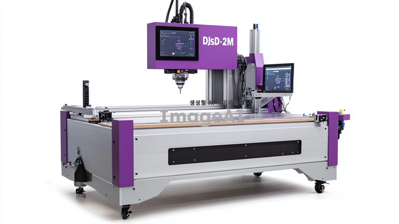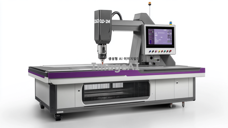 - 고속 CNC 기계로, 고립된 흰색 배경, 보라색과 은색 색상 조합, 앞면에 검은색 글씨로 "DJsD-2M"이라는 큰 텍스트가 있습니다. 오른쪽 위에 큰 디지털 디스플레이가 있으며, 내부를 비추는 LED 조명이 있습니다. 아래쪽에는 바퀴가 달린 회색 금속 받침대가 있고, 제어 패널 아래에는 컴퓨터 인터페이스가 있습니다. 왼쪽에는 검은색 전원 코드가 내려오고, 테이블 상단 아래에는 도구나 장비를 위한 금속 창이 있는 트레이가 부착되어 있으며, 현대 산업적인 외관을 가지고 있습니다.