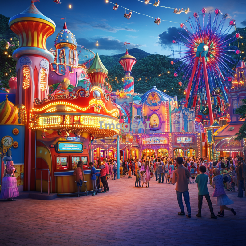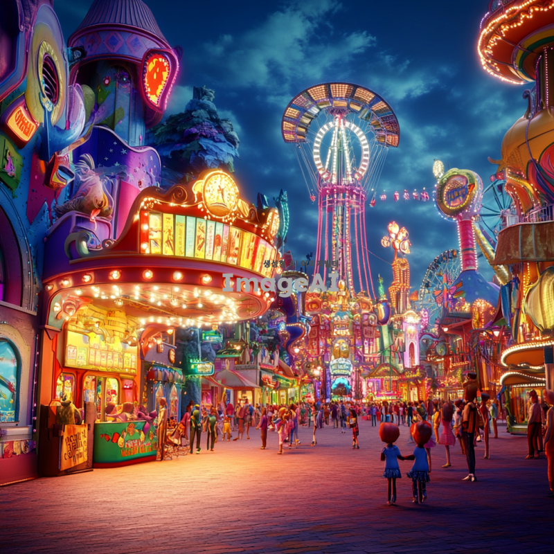 환상적인 놀이동산의 매표소를 3D로 표현한 이미지. 화려한 색감과 독특한 디자인의 건물, 주변에는 다양한 놀이기구와 즐거운 사람들, 밝은 조명과 축제 분위기가 느껴지는 장면. 매표소 앞에는 긴 줄을 서 있는 아이들과 가족들, 즐거운 표정으로 티켓을 구매하는 모습. 전체적으로 환상적이고 꿈 같은 느낌을 주는 이미지.