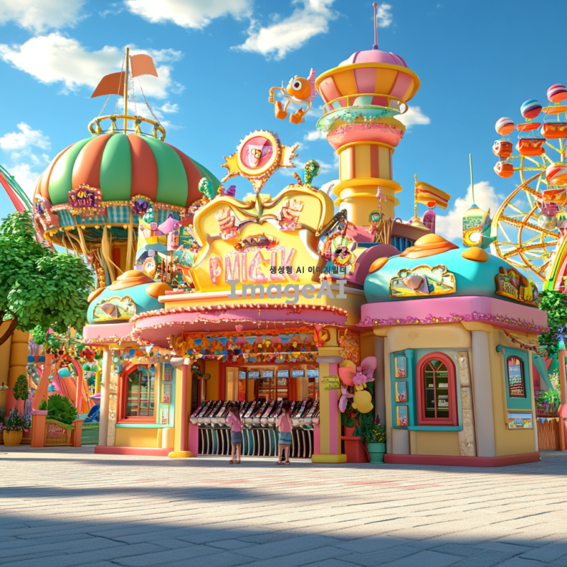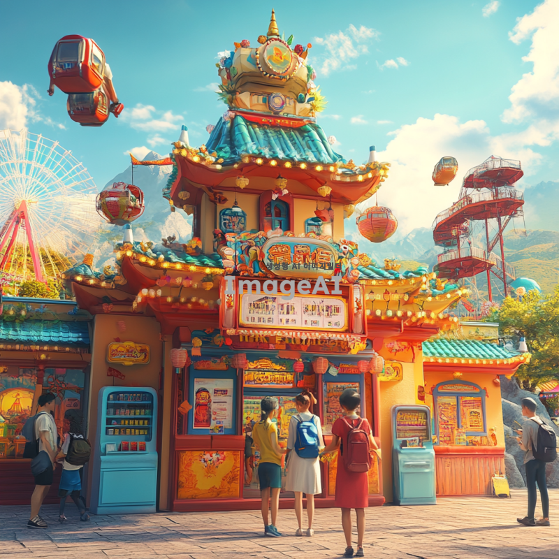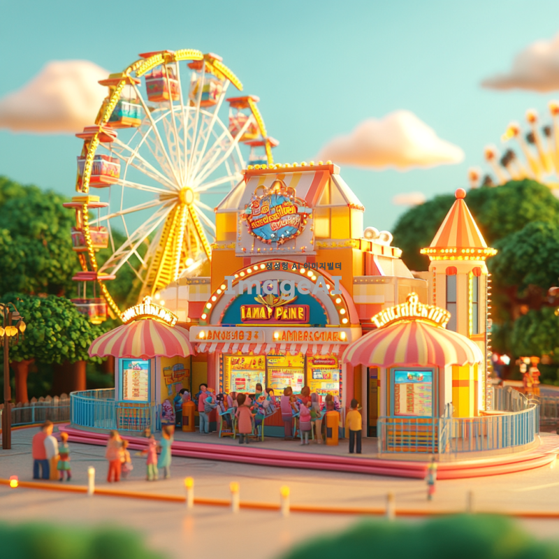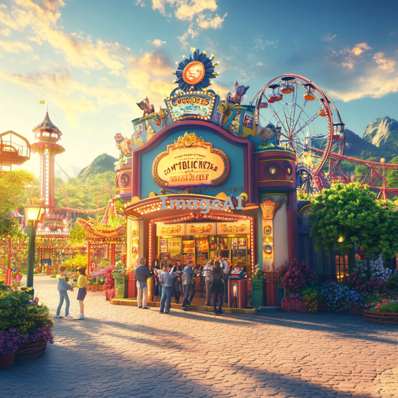 아름다운 3D 놀이동산 매표소, 화려한 색상의 건물, 다양한 놀이기구가 배경에 보이는 풍경, 사람들이 매표소 앞에서 티켓을 구매하는 모습, 따뜻한 햇살 아래 즐거운 분위기, 세부적인 디자인과 디테일이 강조된 장면, 놀이동산의 로고와 장식이 돋보이는 매표소.