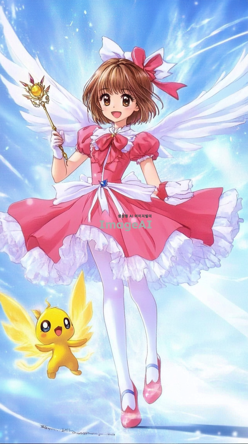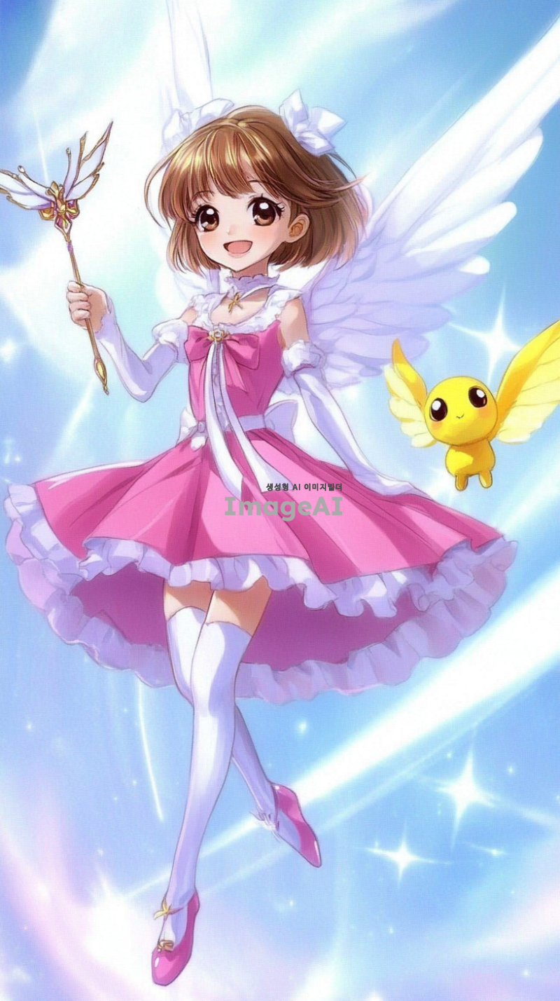 밝고 활기찬 표정을 가진 젊은 한국 소녀가 화려한 분홍색 마법 의상을 입고 있습니다. 의상에는 흰색 포인트와 함께 부풀린 치마, 리본 장식이 포함되어 있습니다. 그녀는 날개가 달린 마법 지팡이를 들고 있으며, 짧은 갈색 머리와 따뜻한 미소를 지니고 있습니다. 그녀 옆에는 작은 노란색 날개 생물이 행복하게 떠 있습니다. 배경은 부드러운 흰색과 파란색 스트라이프가 어우러진 역동적인 하늘로, 마법적이고 환상적인 분위기를 강조하고 있습니다.