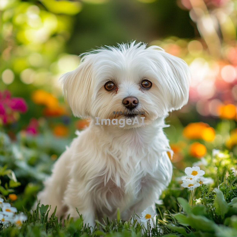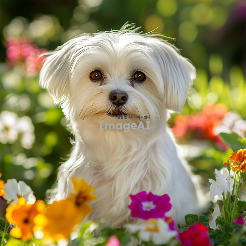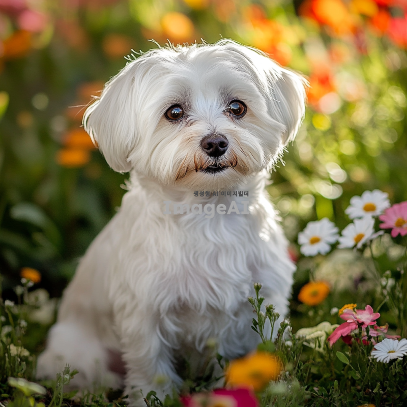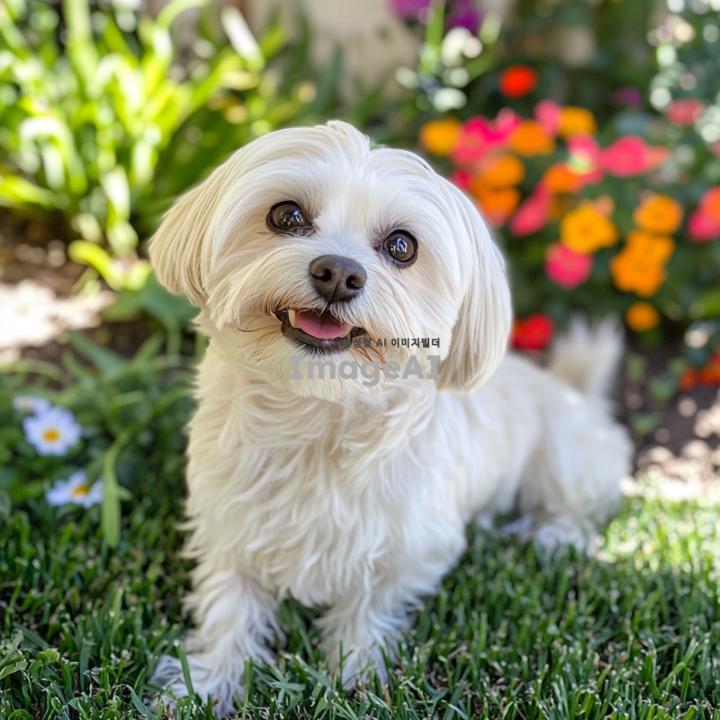 귀여운 말티즈가 햇볕이 잘 드는 정원에서 장난스럽게 놀고 있는 모습, 밝은 색상의 꽃들과 푸른 잔디 배경, 말티즈의 부드러운 털과 큰 눈이 강조되도록, 귀여운 표정으로 카메라를 바라보는 모습.