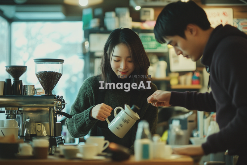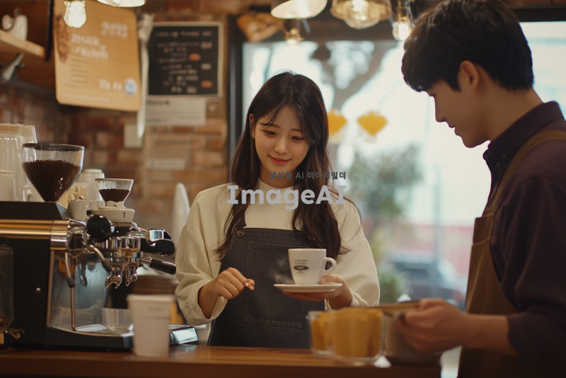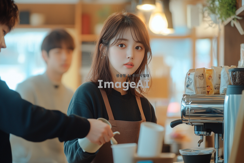 카페에서 일하는 한국인 여자 알바생이 커피를 내리고 있는 모습, 깐깐한 표정의 사장님이 주문을 확인하고 있는 장면, 얄미운 표정의 매니저가 알바생에게 지시를 하고 있는 상황. 카페의 아늑한 분위기와 다양한 커피 메뉴가 보이는 배경.