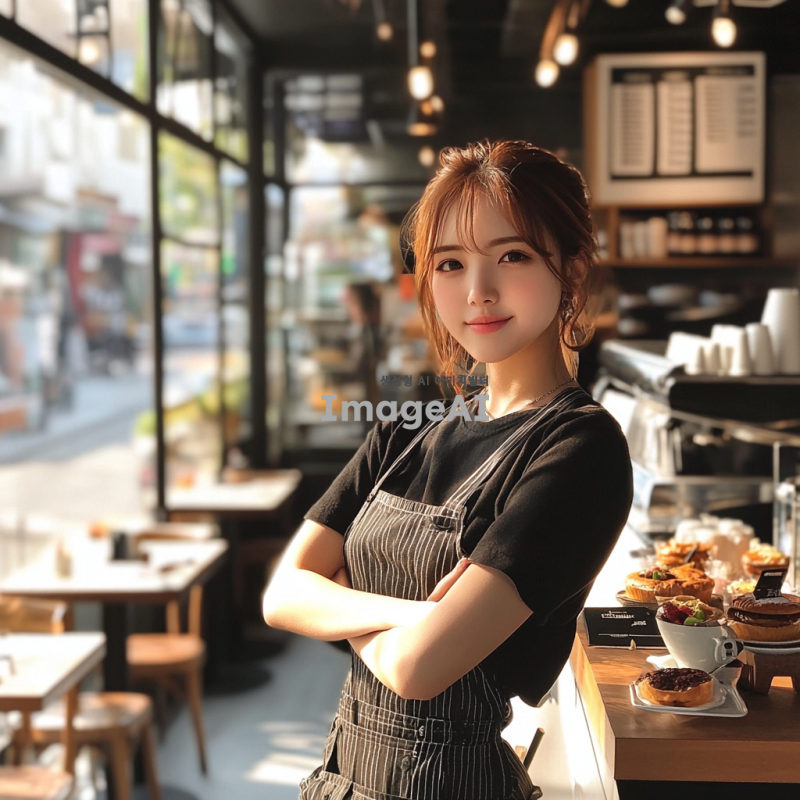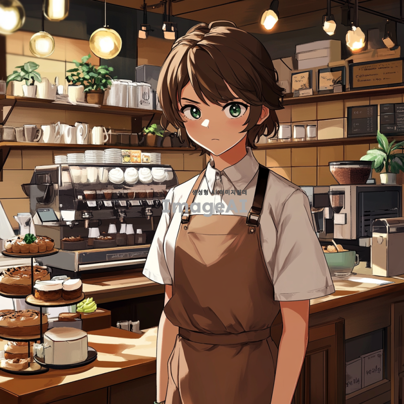 짧은 머리에 친절해 보이지만 못된 카페 알바생 카페 내부의 아늑한 분위기, 다양한 커피와 디저트가 놓인 테이블, 약간의 장난스러운 표정