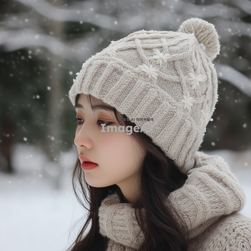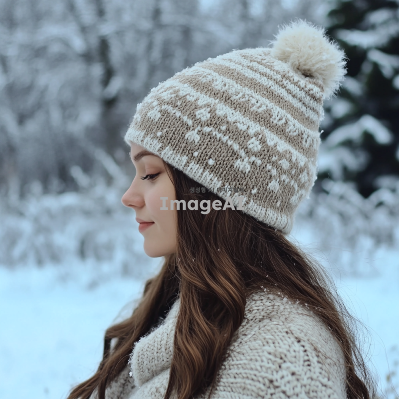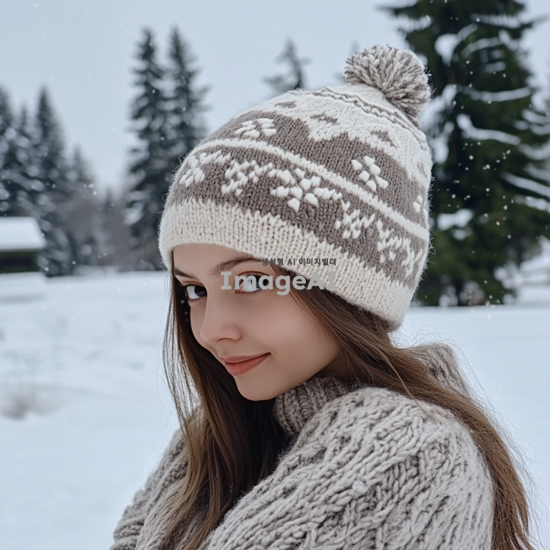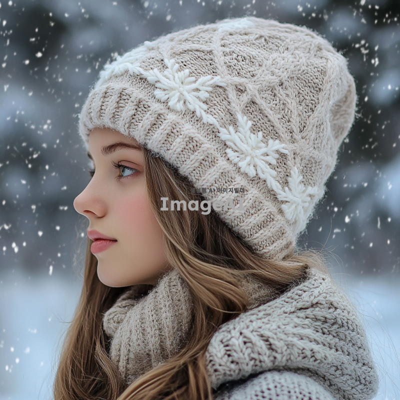 따뜻한 느낌의 추운 겨울에 어울리는 오버사이즈 모자를 디자인해 주세요. 부드러운 니트 소재로, 따뜻한 색조의 회색과 베이지가 혼합된 패턴을 사용하고, 귀여운 포인트로 작은 눈송이 자수 장식을 추가합니다. 모자의 크기는 넉넉하게 디자인하여 편안함을 강조하고, 겨울의 차가운 바람을 막아줄 수 있도록 귀를 덮는 스타일로 만들어 주세요. 배경은 눈이 내리는 겨울 풍경으로 설정합니다.