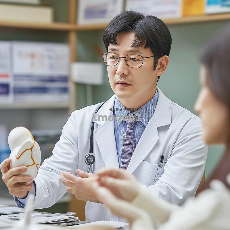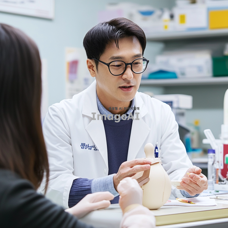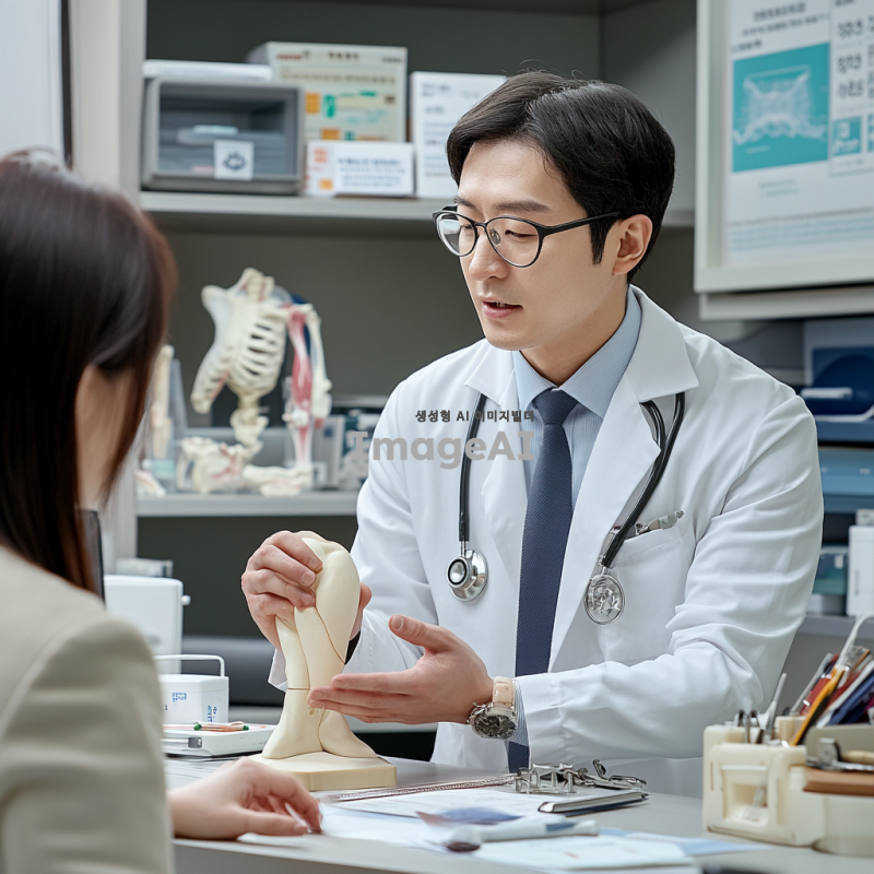 테니스 엘보우 치료를 진행하고 있는 한국인 의사 모습, 팔꿈치 모형을 활용하여 환자와 상담하는 장면, 진료실 배경, 의사가 진지한 표정으로 설명하는 모습, 의료 도구와 자료가 있는 환경, 전문적인 분위기.