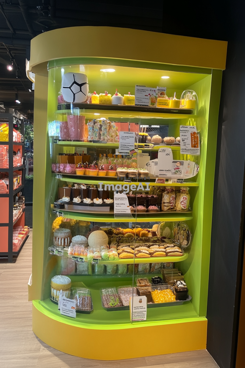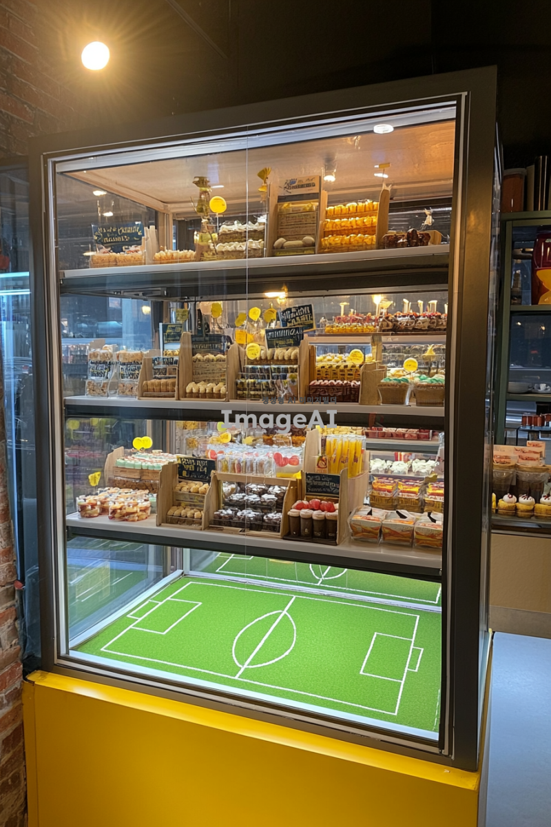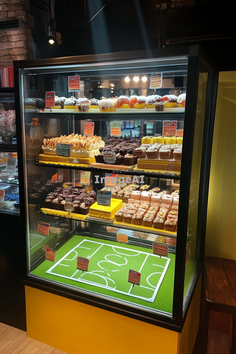 3층짜리 디저트 쇼케이스가 축구장 느낌으로 꾸며져 있고 쇼케이스 내부는 디저트 안내 pop로 진열되어 있는 사진