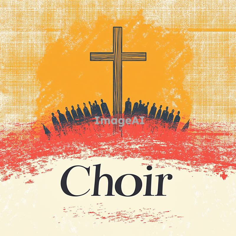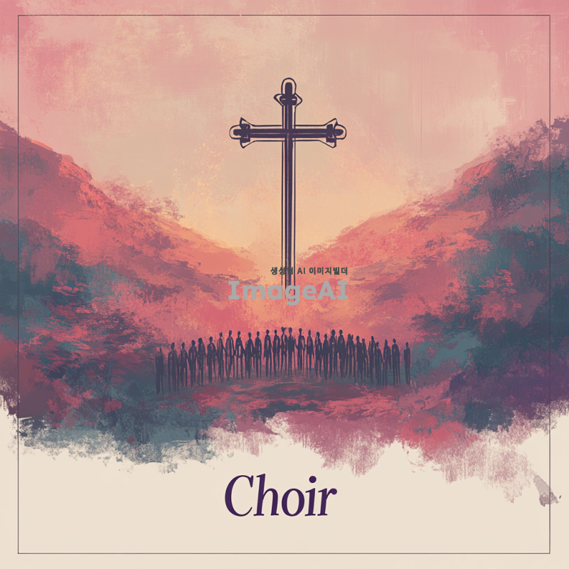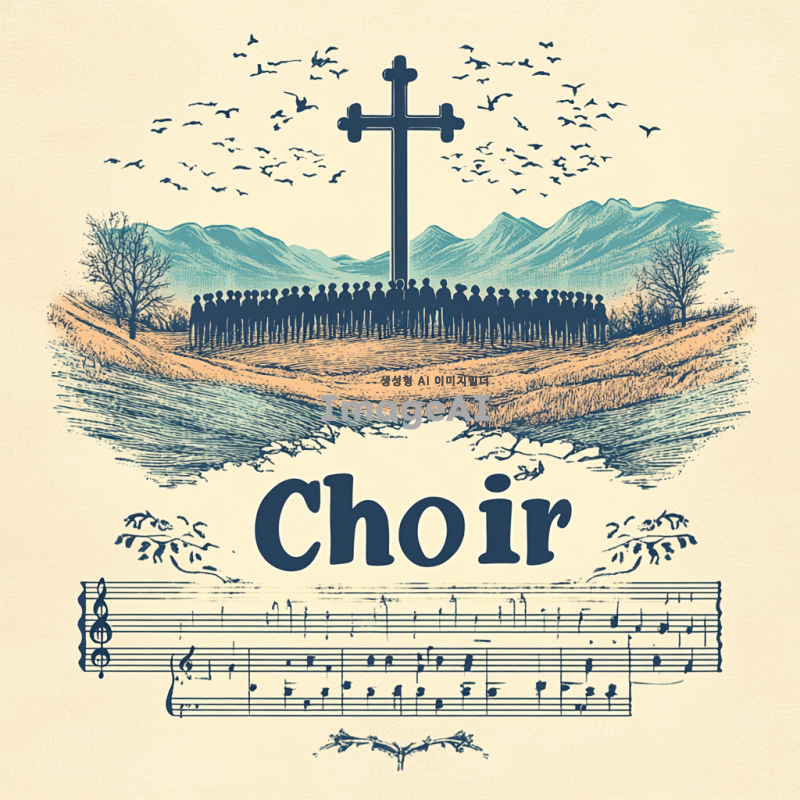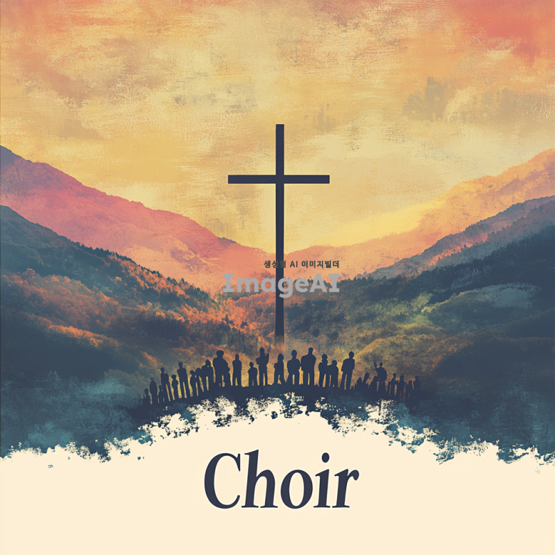성가대 악보 표지를 위한 디자인, 한국의 전통적인 요소와 현대적인 감각이 조화롭게 어우러진 스타일, 기독교 상징인 십자가와 성가대의 모습이 포함된 이미지, 따뜻하고 영감을 주는 색상 조합, 고급스러운 느낌의 서체로 "성가대"라는 제목이 잘 보이도록 배치, 배경은 부드러운 그라데이션 또는 자연 풍경으로 설정.
