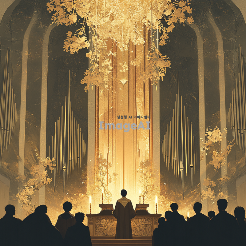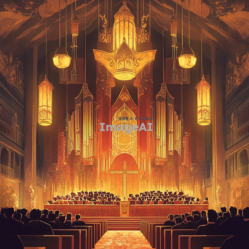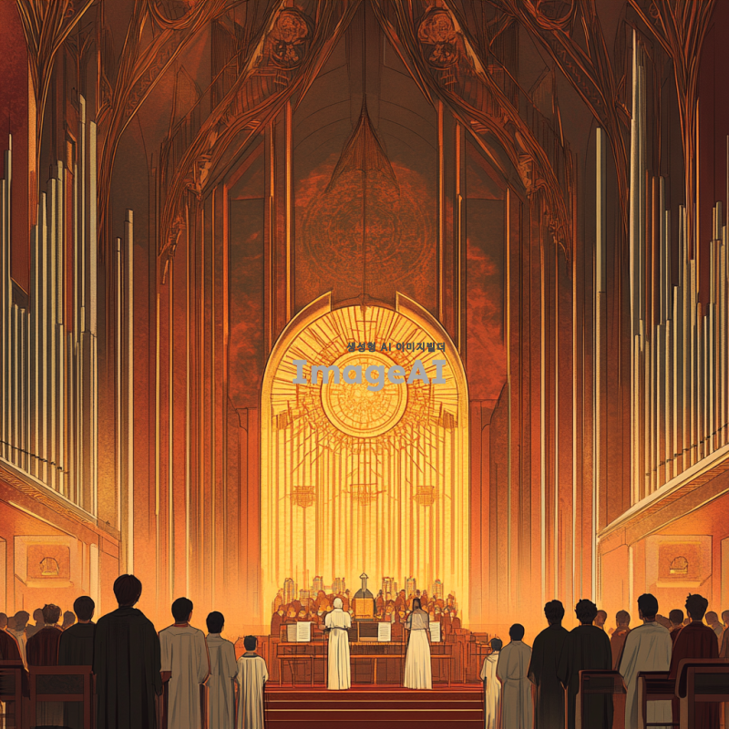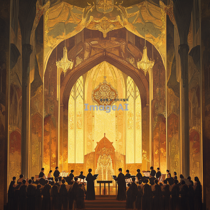 신성한 느낌의 성가대 악보 표지를 위한 디자인, 고풍스러운 성당 내부 배경, 부드럽고 따뜻한 조명, 성가대의 모습이 담긴 장면, 화려한 색감과 세밀한 디테일, 종교적 상징들이 어우러진 아름다운 일러스트, 한국 전통 요소가 가미된 디자인, 경건하고 평화로운 분위기.