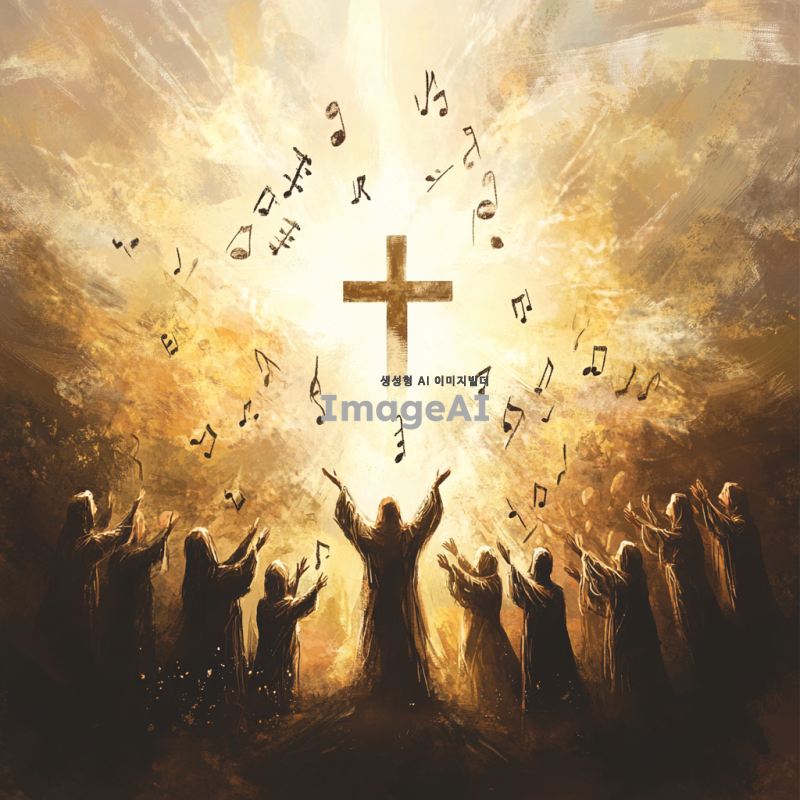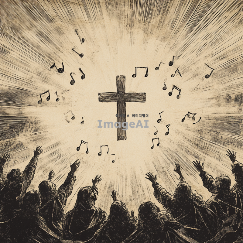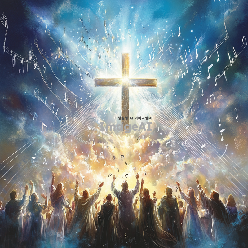 성가대 악보 표지를 위한 디자인,중앙에는 십자가를 둘러싸며 찬양을 하는 성도들,공중에 음표가 날아다니는 그림,전체적인 분위기는 천국 분위기