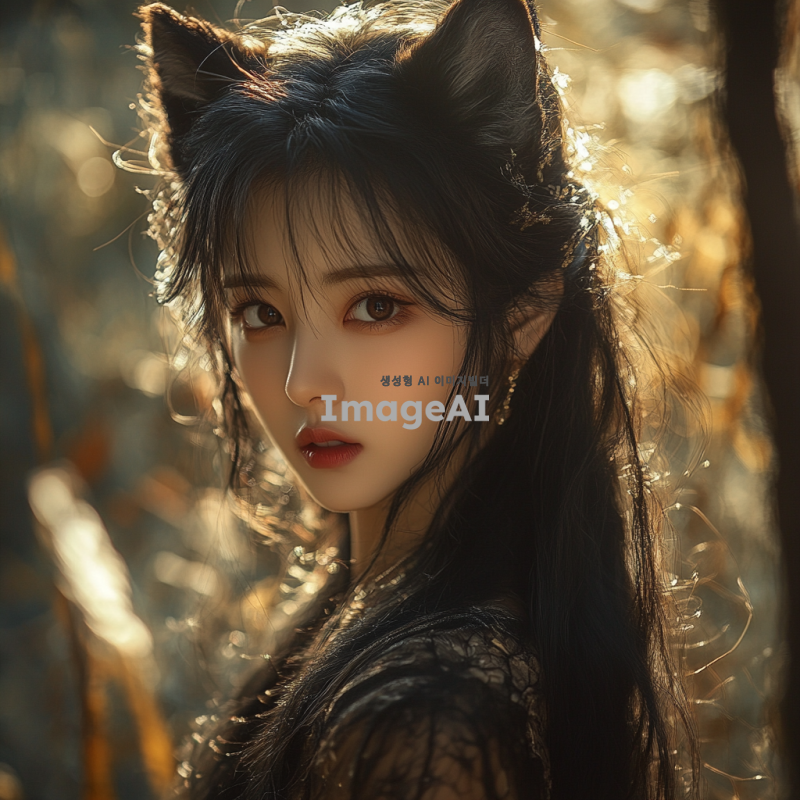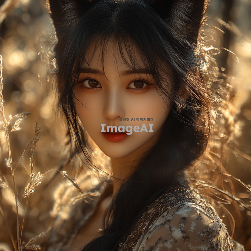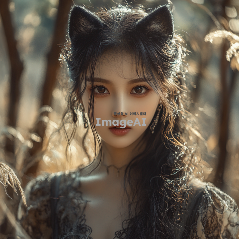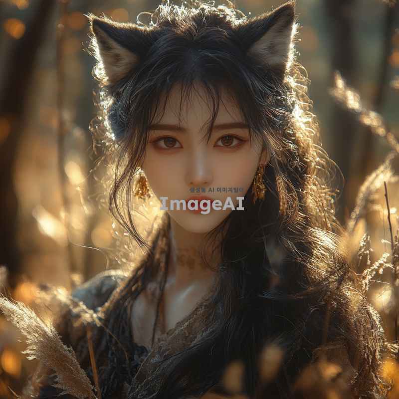늑대 귀를 가진 한국 여성, 긴 검은 머리, 깊은 갈색 눈, 자연 속에서 신비로운 분위기, 야생의 느낌을 주는 의상, 부드러운 표정, 주변에 나무와 풀, 따뜻한 햇살이 비치는 장면.