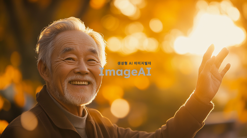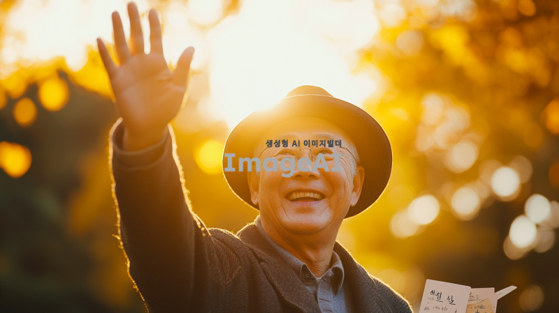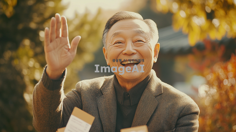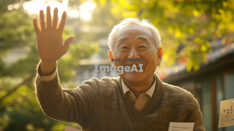파킨슨병을 극복하고 있는 한국인 환자가 미소를 지으며 손을 흔드는 모습, 따뜻한 자연 배경과 함께 희망적인 분위기, 부드러운 조명 아래에서 긍정적인 에너지를 전하는 이미지. 환자의 주변에는 응원의 메시지가 적힌 카드들이 놓여 있어, 서로를 격려하는 따뜻한 순간을 표현.