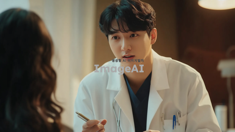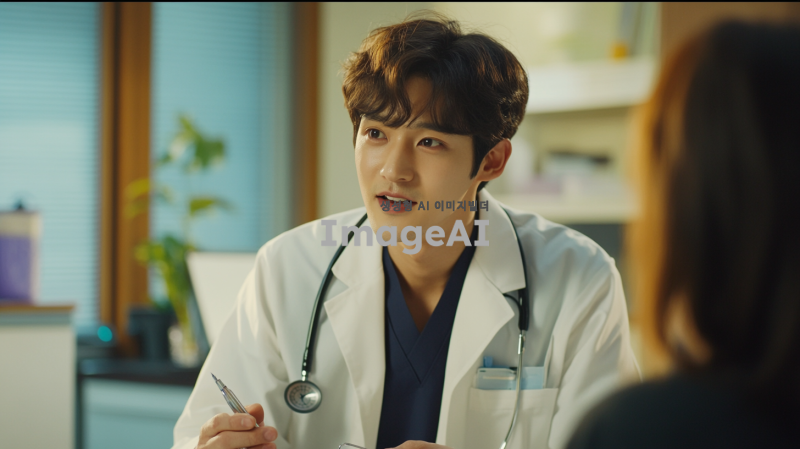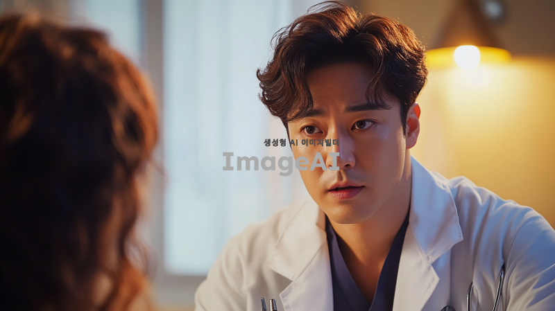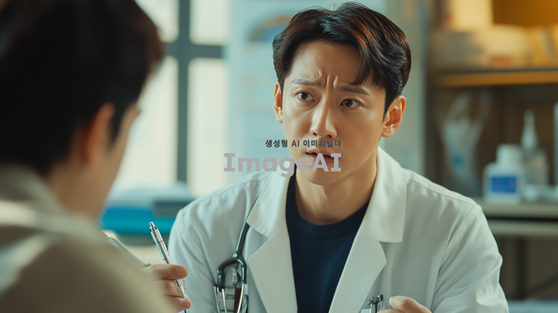 질병에 대한 정보를 전달하는 한국인 남성 의사, 진지한 표정으로 환자와 대화하는 모습, 의사 가운을 입고 손에 의료 도구를 들고 있는 모습, 배경은 병원 진료실, 따뜻한 조명으로 편안한 분위기, 전문적인 느낌 강조