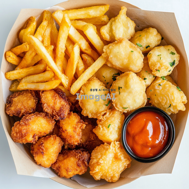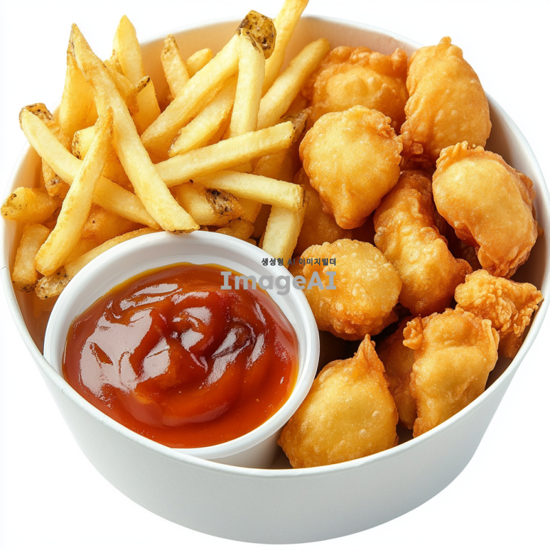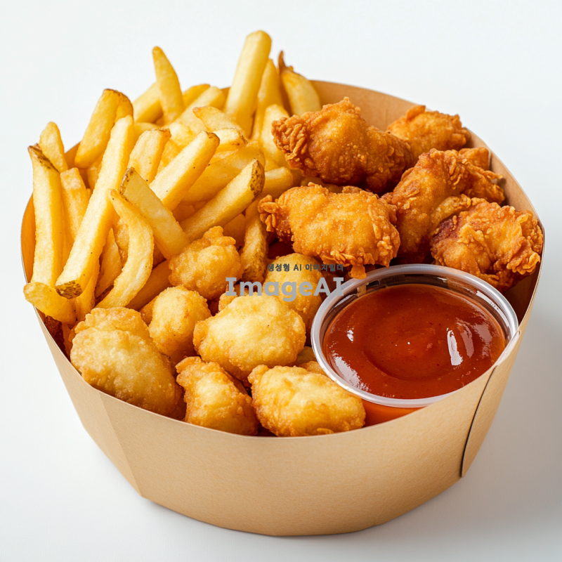 종이그릇 안에 바삭한 감자튀김, 고소한 튀김만두, 그리고 바삭하게 튀겨진 치킨너겟이 가득 담겨 있는 장면을 그려줘. 그릇은 자연스러운 하얀색으로, 음식들은 황금빛으로 빛나고, 주변에는 간단한 소스와 함께 맛있게 플레이팅된 모습이 담겨 있어야 해. 배경은 하얀색으로.