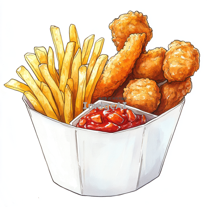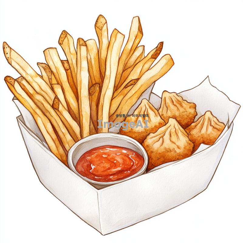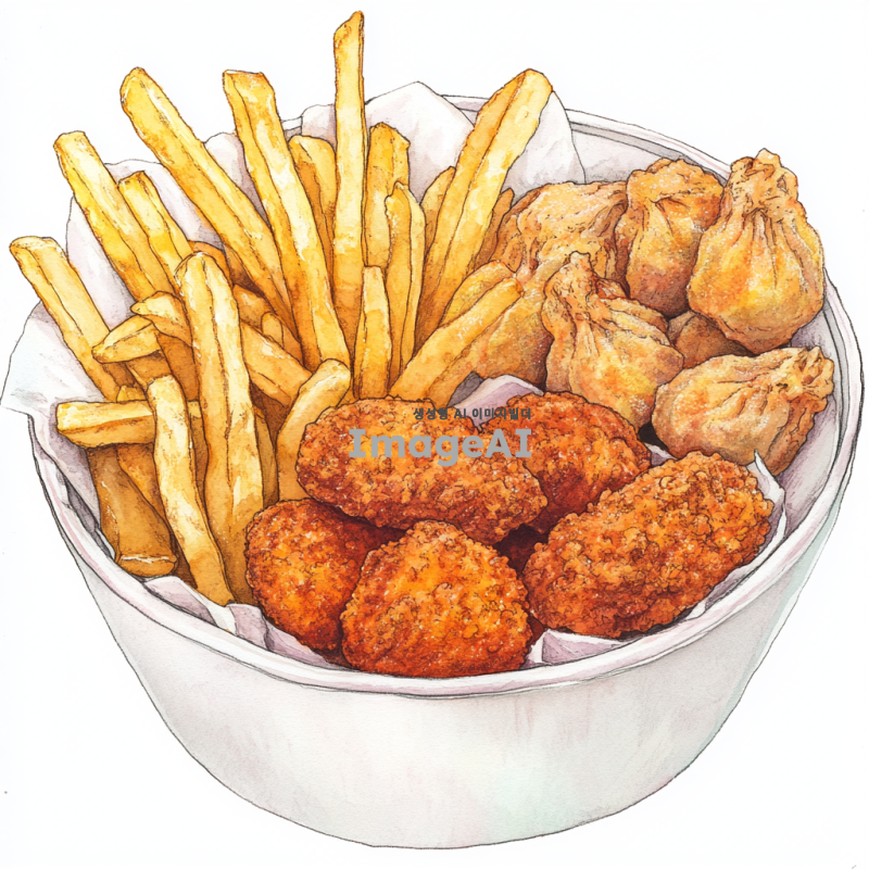 하얀 종이그릇 안에 담긴 바삭한 감자튀김, 노릇노릇한 용가리 치킨너겟, 그리고 맛있게 튀겨진 만두가 조화롭게 어우러져 있는 풍경을 그려줘. 배경은 하얀색, 음식의 색감이 돋보이도록 해줘.