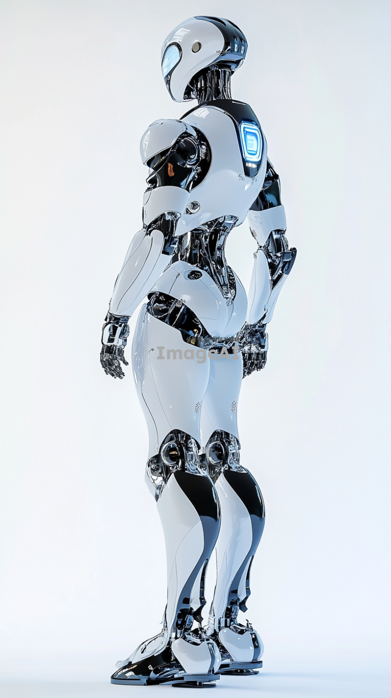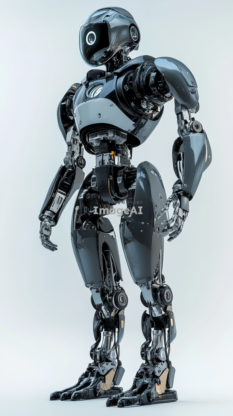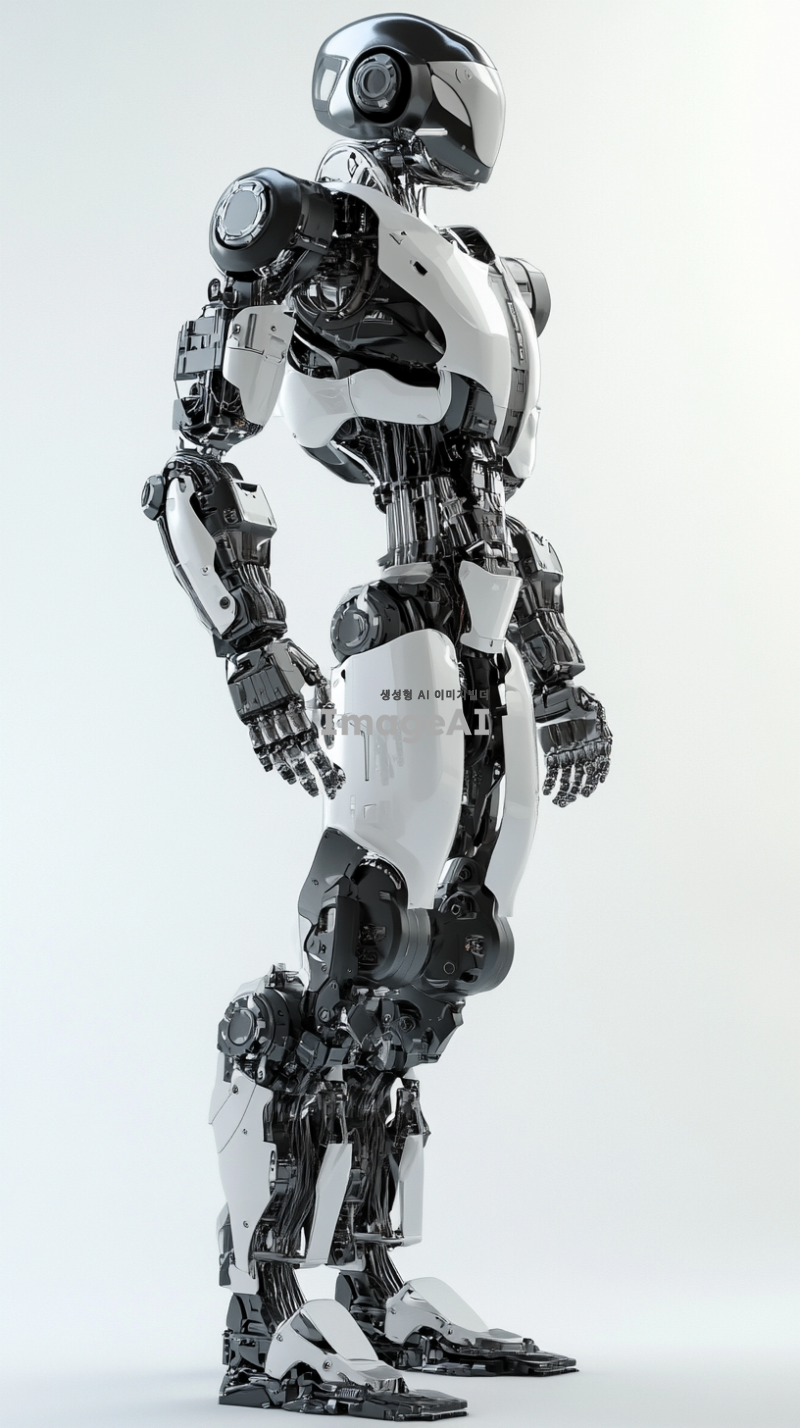 로봇이 발과 다리가 잘 보이도록 서 있는 모습, 현대적인 디자인과 세련된 외관, 메탈릭한 색감,