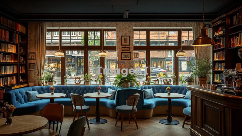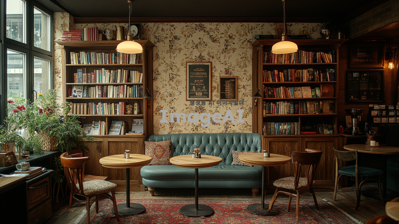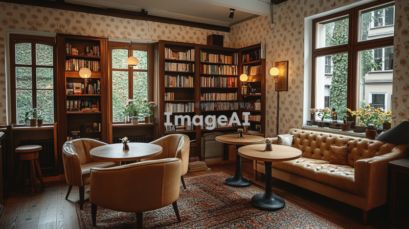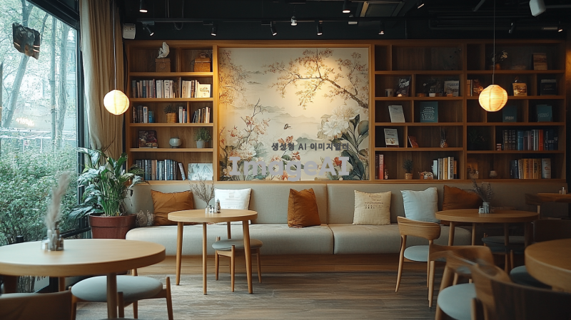 크림색 벽지로 장식된 아늑한 커피숍 내부, 따뜻한 스탠딩 조명이 비추는 공간, 여러 개의 라운드 테이블이 배치되어 있음. 한쪽 코너에는 작은 소파와 아기자기한 책꽂이가 놓여 있으며, 테이블들과 소파, 책꽂이는 가벽이나 커튼으로 부드럽게 분리되어 있는 모습. 전체적으로 따뜻하고 편안한 분위기를 자아내는 커피숍의 풍경.