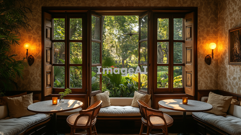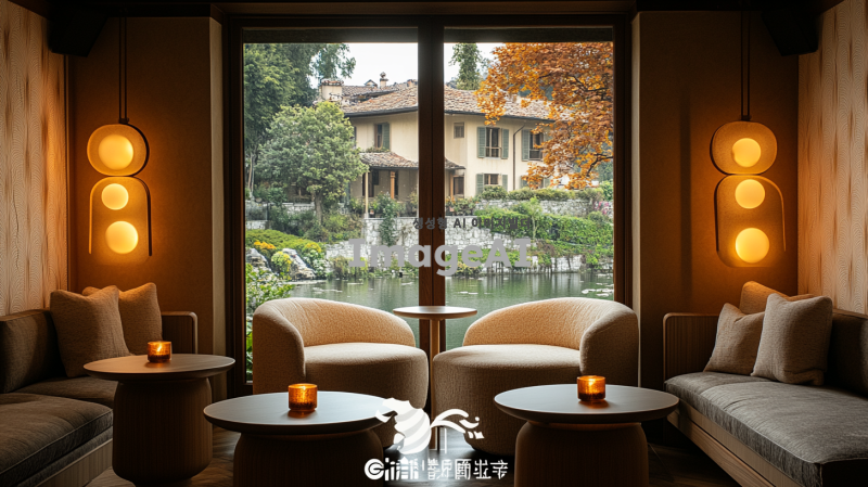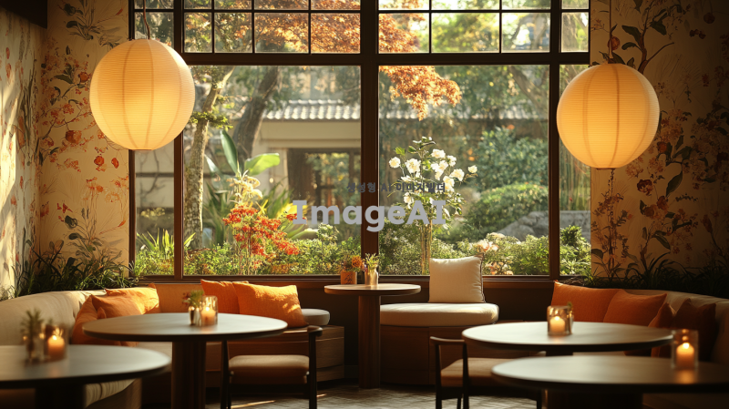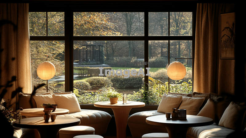 크림색 벽지로 장식된 아늑한 방, 따뜻한 스탠딩 조명이 비추는 공간, 4개의 라운드 테이블이 배치되어 있으며, 한쪽 모서리에는 아주 작은 소파가 놓여 있다. 창밖에는 아름답게 가꿔진 정원이 보인다.