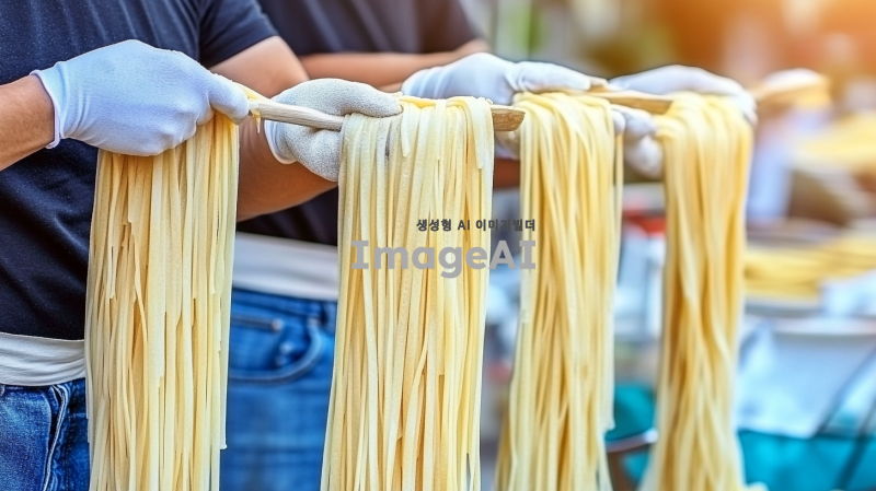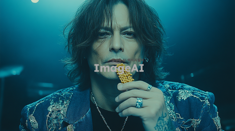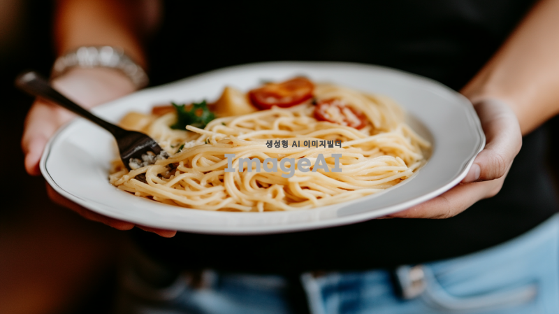 남자 일본인 바지는 청바지이고 티셔츠는 검정색 파스타를 먹고 있어