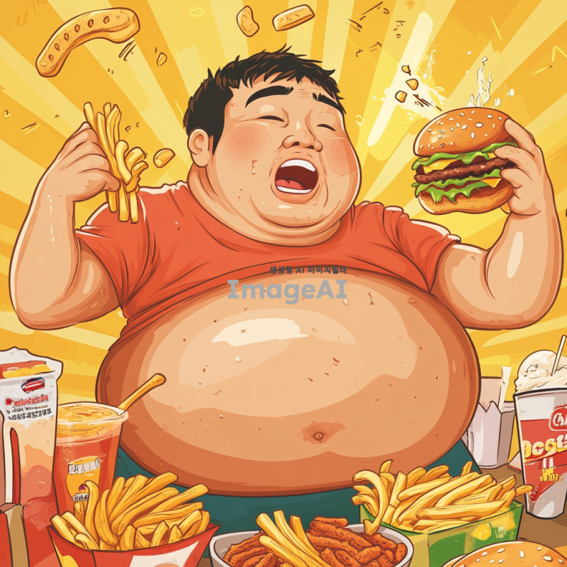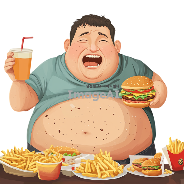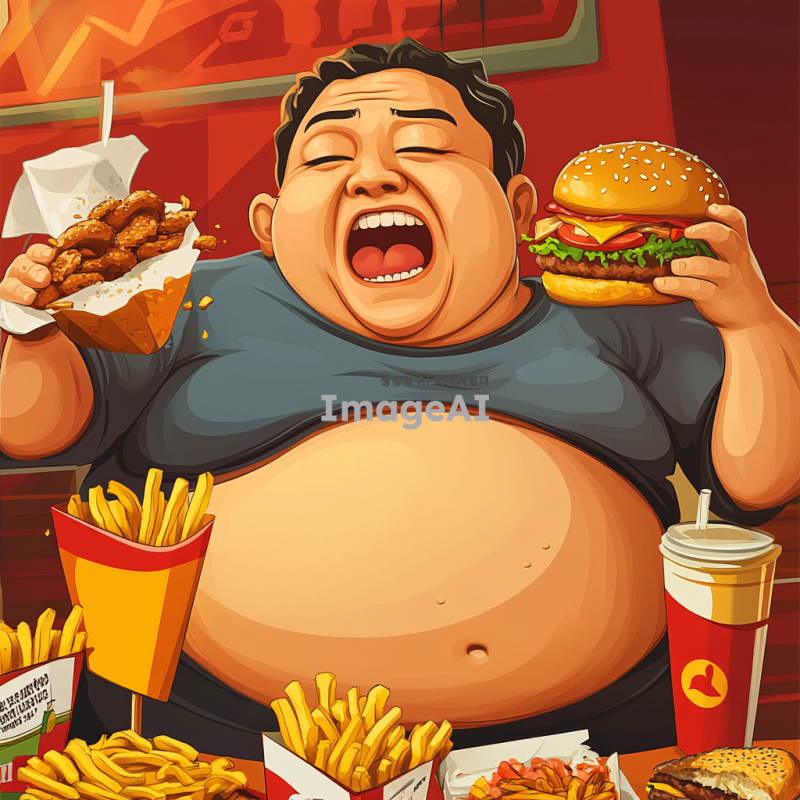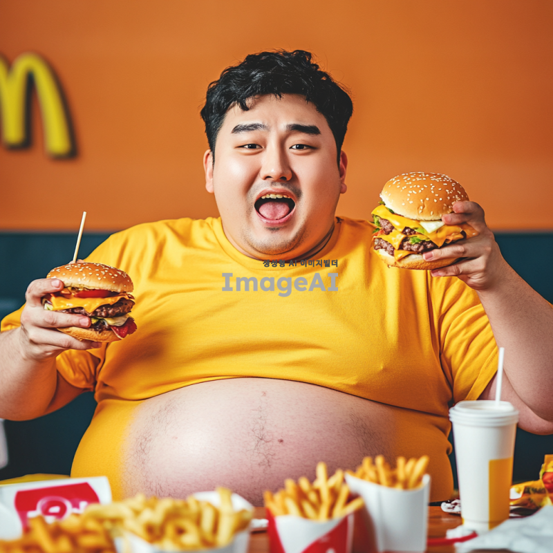 과식으로 배가 부풀어 오른 한국인 남성이 패스트푸드를 먹고 있는 모습. 배가 두드러지게 나와 있고, 다양한 패스트푸드 메뉴들이 주변에 널려 있는 상황. 남성은 즐거운 표정으로 햄버거를 한 손에 들고 있으며, 감자튀김과 음료수도 함께 있는 장면. 배경은 패스트푸드 레스토랑의 내부로, 활기찬 분위기를 연출.