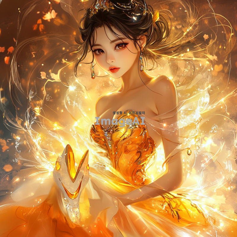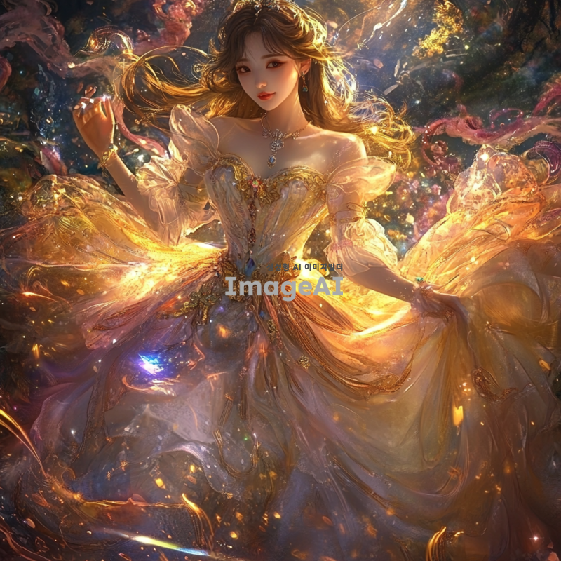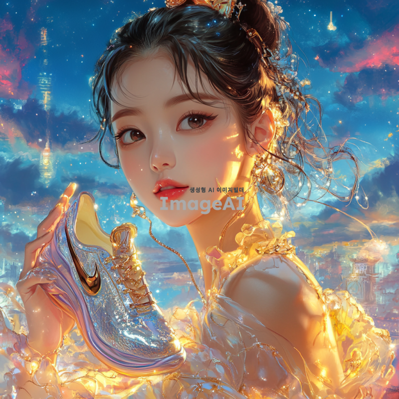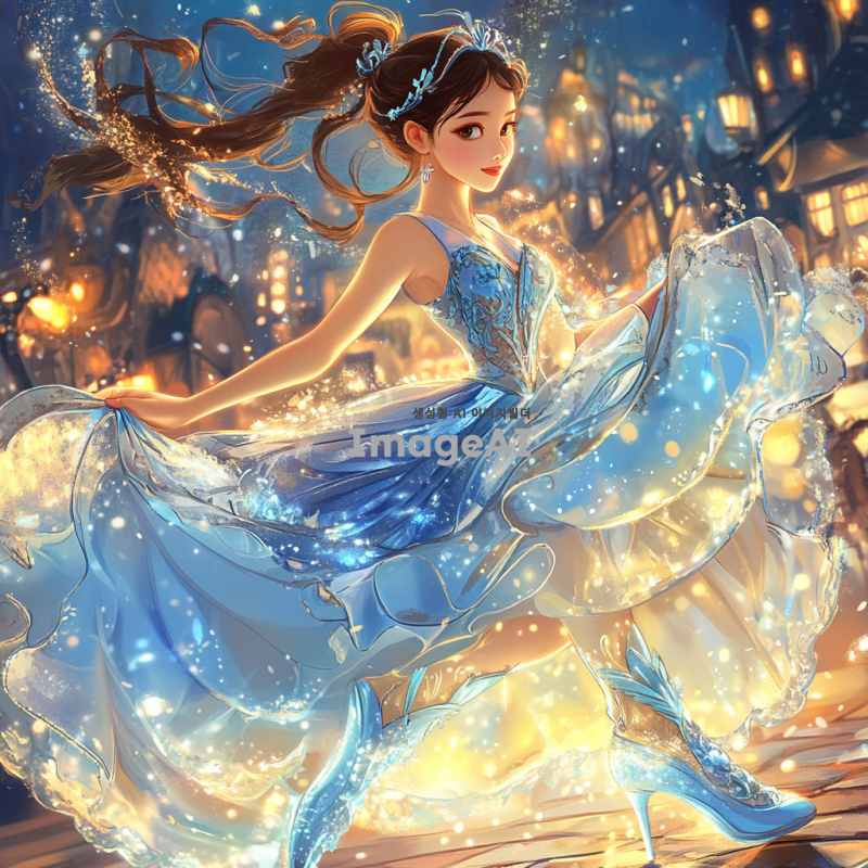 니케 신데렐라, 현대적인 스타일로 재해석된 한국인 여성 캐릭터, 화려한 드레스와 마법의 유리 구두를 착용하고, 신비로운 배경 속에서 꿈꾸는 듯한 표정, 밝고 따뜻한 색감, 판타지 요소가 가미된 일러스트.