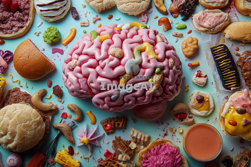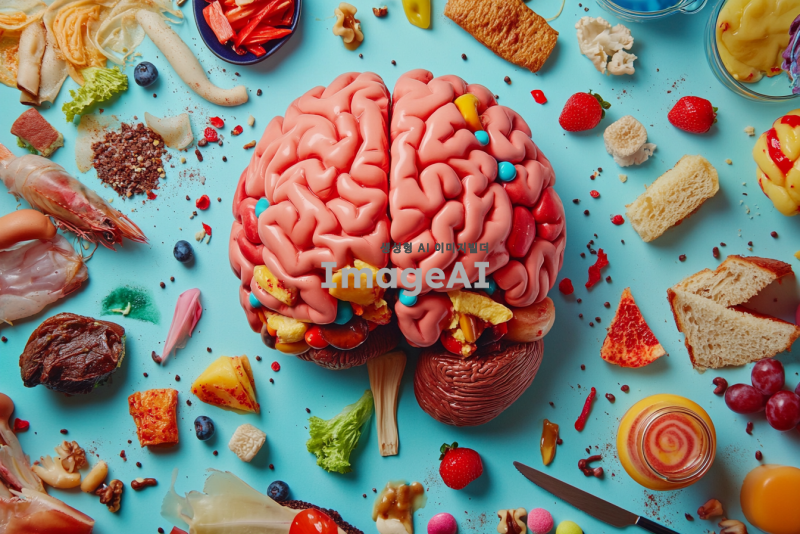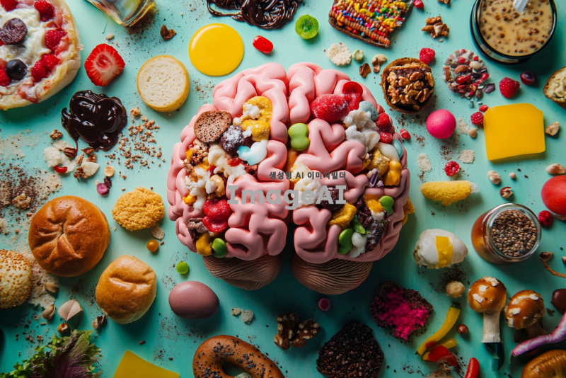 음식을 잔뜩 먹고 행복감에 가득 찬 한국인의 뇌 사진, 뇌의 여러 부분이 밝고 생동감 있게 표현되며, 도파민이 넘쳐 흐르는 느낌을 주는 색감과 질감으로 가득 찬 이미지, 뇌 주변에는 다양한 음식들이 흩어져 있어 즐거운 분위기를 연출하는 장면.