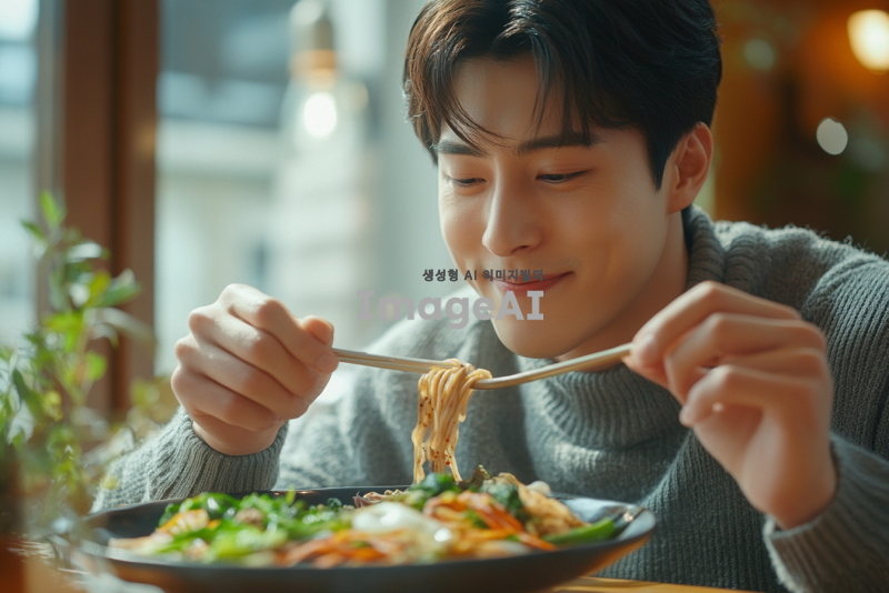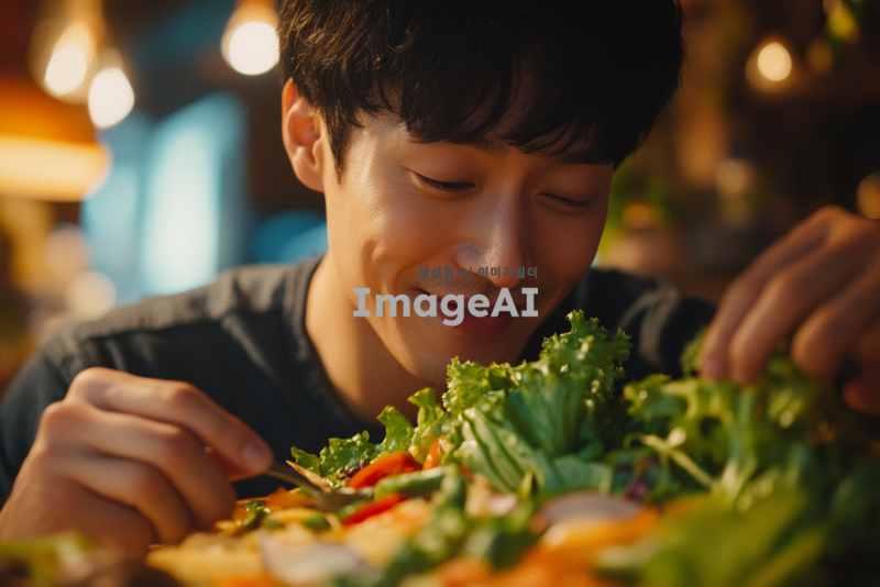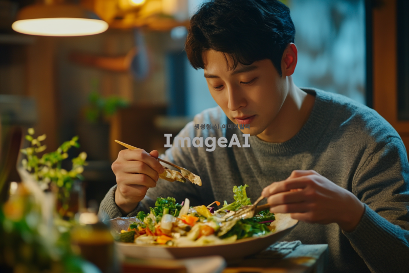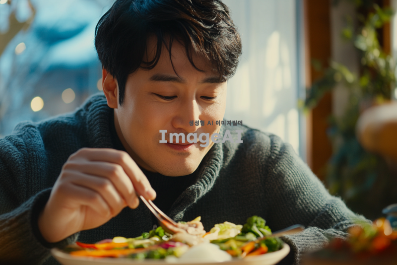 신선한 야채와 질 좋은 음식을 천천히 음미하며 먹고 있는 한국인 남성의 모습. 자연광이 비치는 아늑한 식탁에서 다양한 색상의 신선한 채소와 함께 정성스럽게 준비된 요리를 즐기는 모습. 음식의 질감과 색상이 돋보이도록 가까이에서 촬영된 장면, 편안한 표정으로 음식을 맛보는 모습. 배경은 따뜻하고 아늑한 분위기로, 식사하는 환경이 강조되도록 설정.