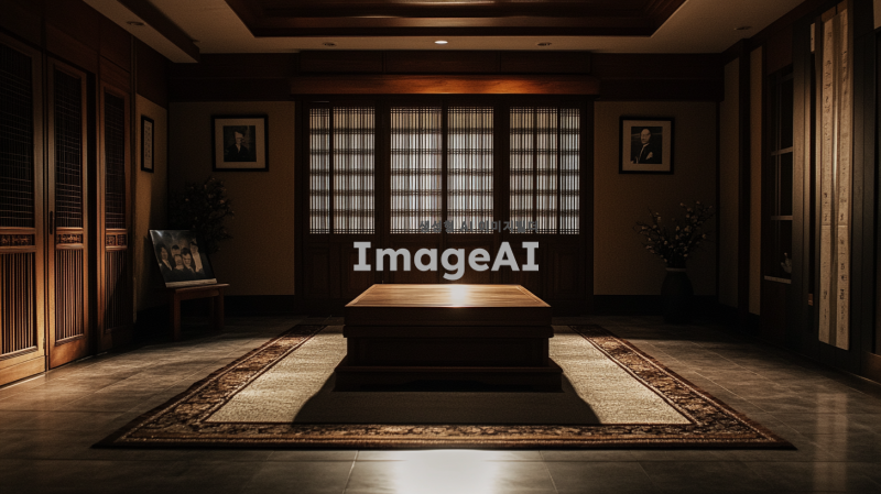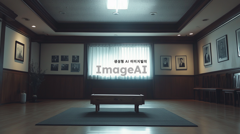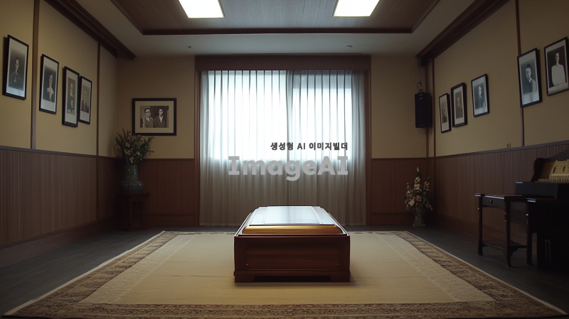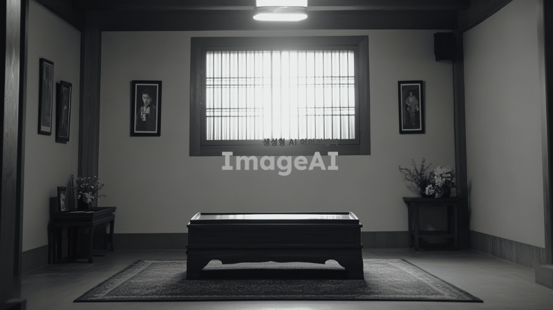 텅 빈 장례식장, 어두운 조명 아래 고요한 분위기, 중앙에 놓인 나무 관, 벽에는 흑백 사진들이 걸려있고, 바닥은 깔끔하게 정리된 카펫, 창문 밖으로 희미하게 비치는 빛, 슬픔이 감도는 정적한 공간, 한국 전통 장례식의 요소가 포함된 장면