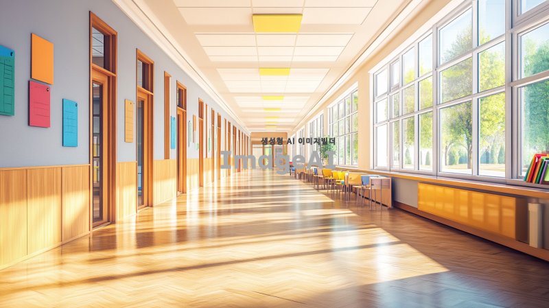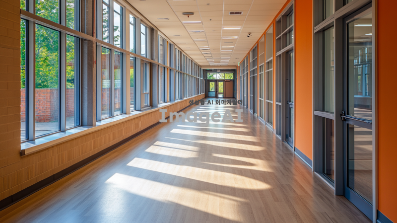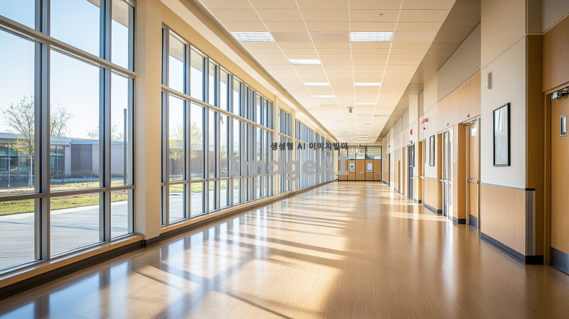 텅 빈 학교 복도의 모습, 현대적인 디자인과 따뜻한 조명,바닥은 나무 재질로 되어 있으며, 창문을 통해 자연광이 들어오고, 복도 끝에는 교실이 보이는 풍경.