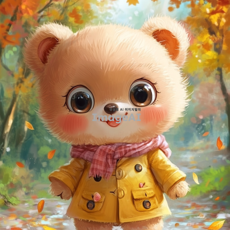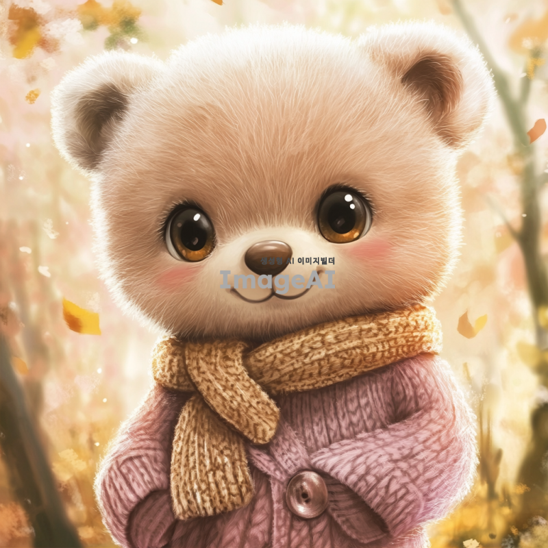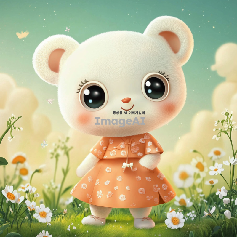 여자곰 캐릭터, 귀엽고 사랑스러운 디자인, 부드러운 털과 큰 눈, 따뜻한 미소, 자연 속에서 놀고 있는 모습, 아기자기한 배경, 밝고 화사한 색감, 한국적인 요소가 가미된 의상, 친근하고 유쾌한 분위기