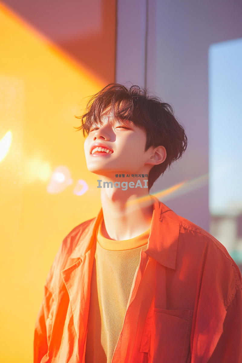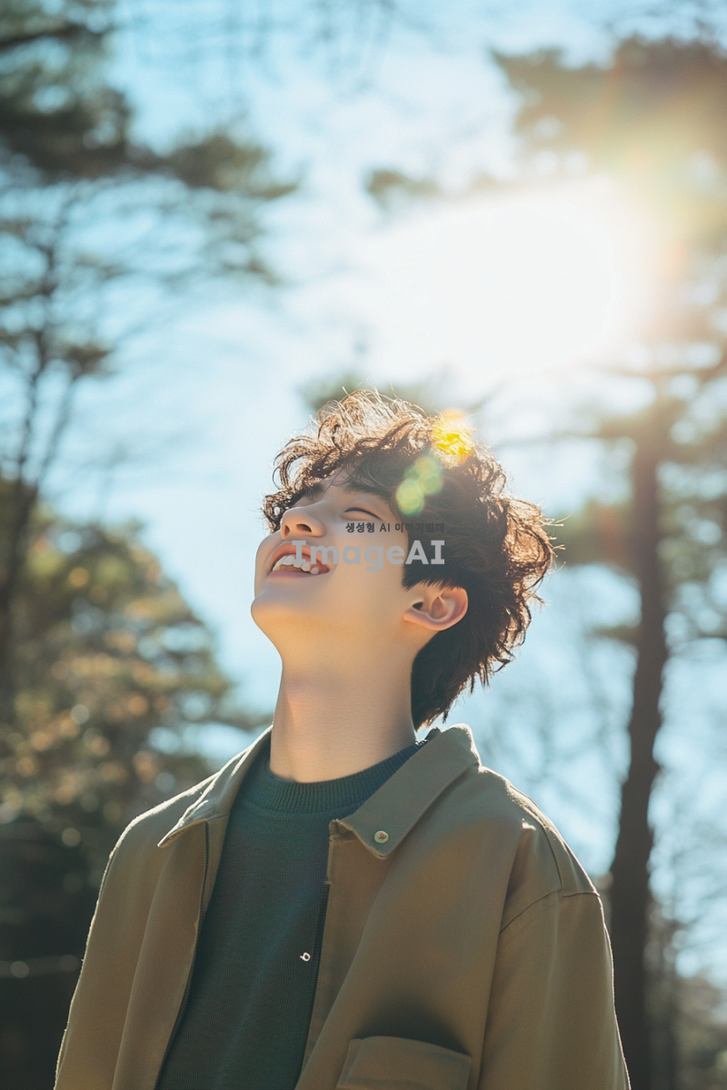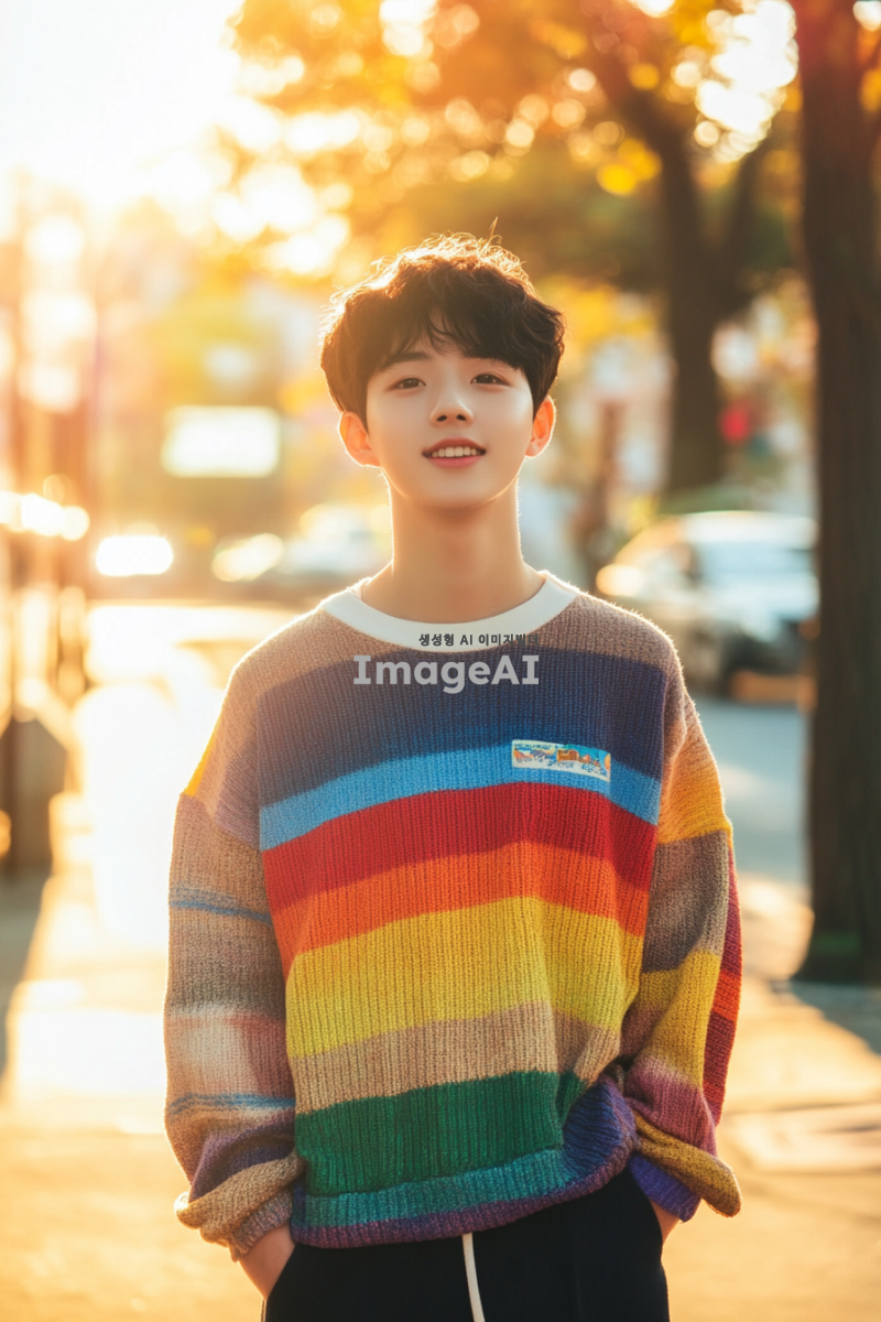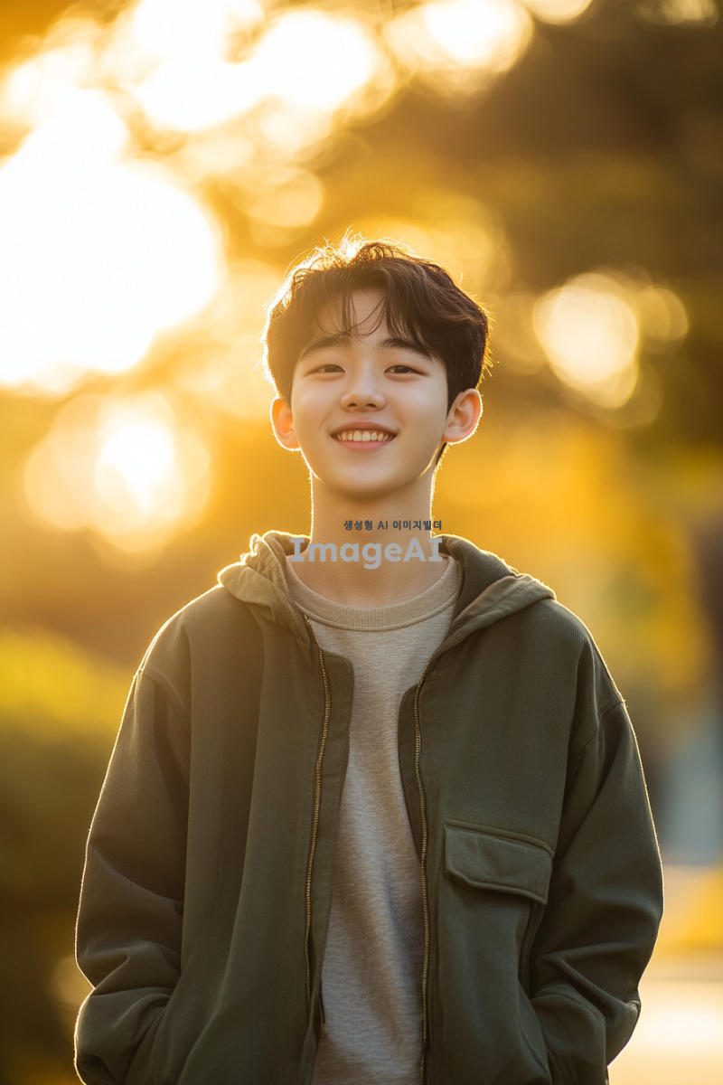 16살 한국 소년이 서 있는 모습, 밝은 햇살 아래, 편안한 복장, 미소를 지으며,, 청량한 분위기,생동감 넘치는 색감.
