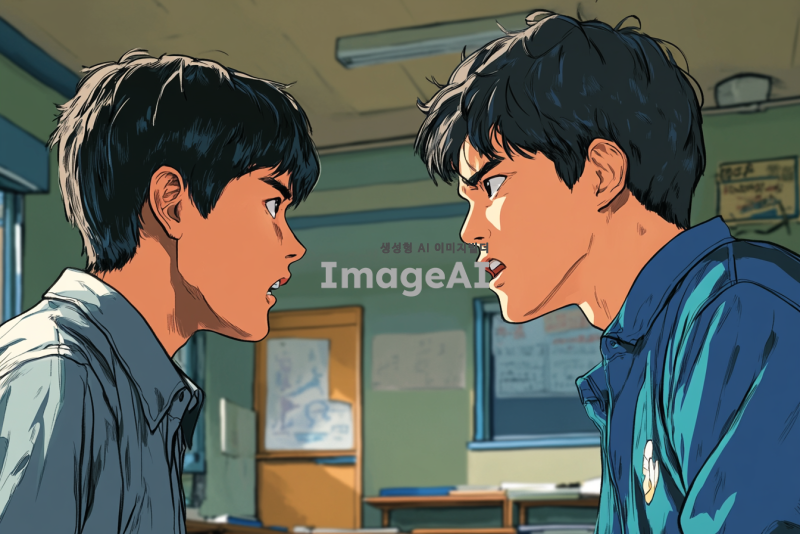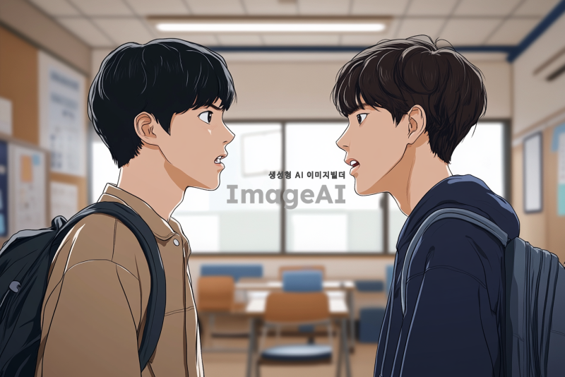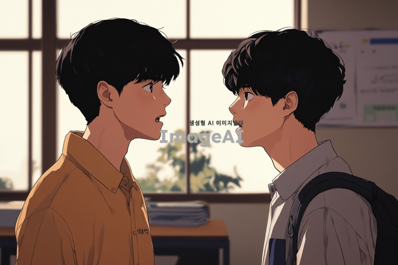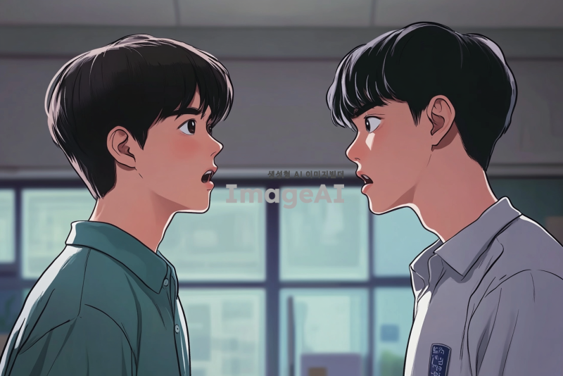 15살 한국 소년이 16살 한국 소년에게 강하게 이야기하는 장면, 두 소년은 서로를 바라보며 긴장감이 감도는 표정을 짓고 있다. 배경은 학교 교실로, 주변에는 아무도 없다. 16살 소년은 단정한 교복을 입고 있으며, 15살 소년은 캐주얼한 옷차림이다. 두 소년의 감정이 잘 드러나도록, 얼굴 표정과 몸짓에 집중하여 그려준다.