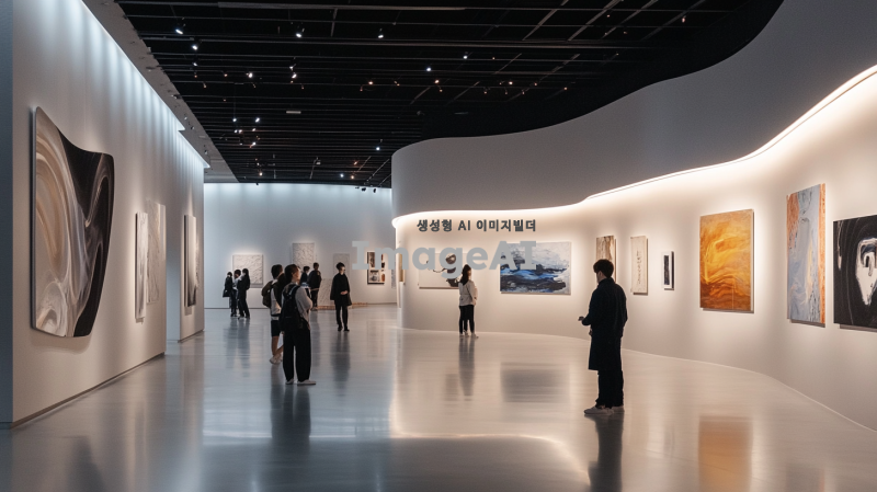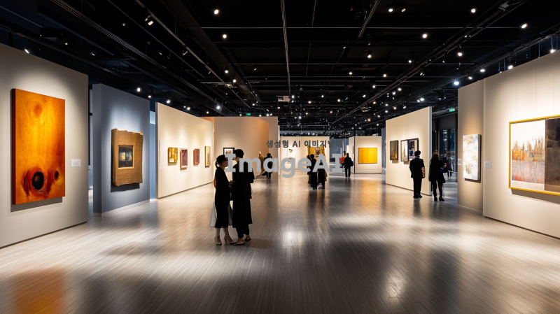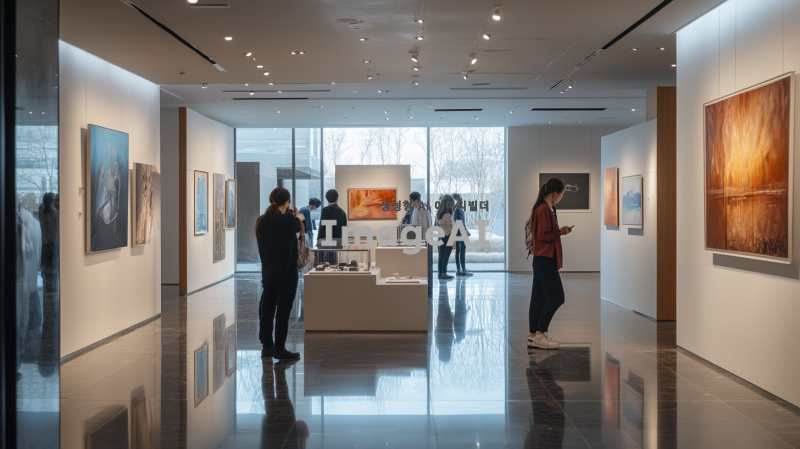 우아하고 현대적인 갤러리 전시회장 내부, 고급스러운 조명과 세련된 벽면, 다양한 예술 작품이 전시되어 있는 공간, 관람객들이 작품을 감상하며 대화하는 모습, 현대 미술의 느낌을 강조한 디자인, 한국적인 요소가 섞인 모던한 분위기.