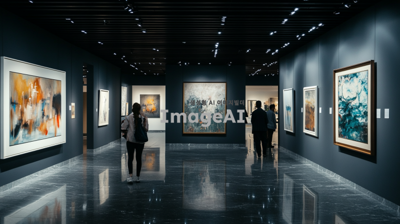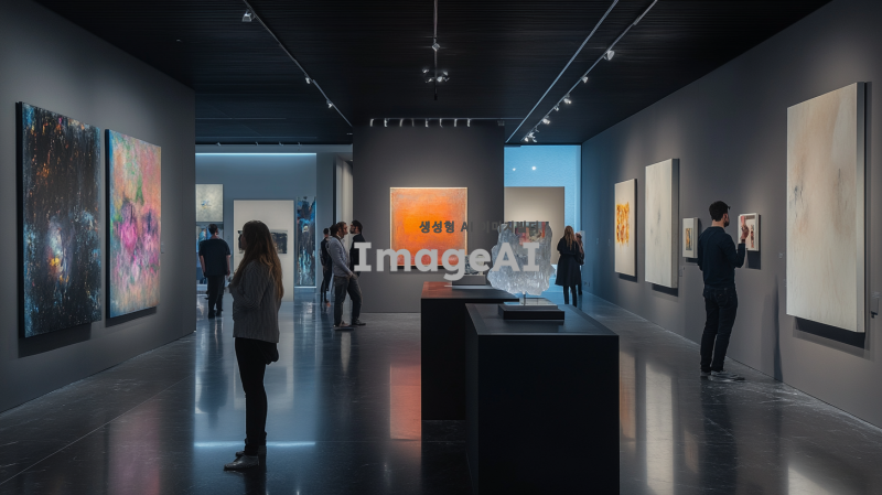 어두운 분위기의 모던한 갤러리 내부, 고급스러운 조명 아래 다양한 현대 미술 작품들이 전시되어 있는 모습, 벽은 깊은 회색 톤으로 칠해져 있으며, 바닥은 매끄러운 검은색 대리석, 관람객들이 작품을 감상하고 있는 모습, 전체적으로 세련되고 미니멀한 디자인의 공간, 미술 작품의 색감이 강조되는 조명 효과.