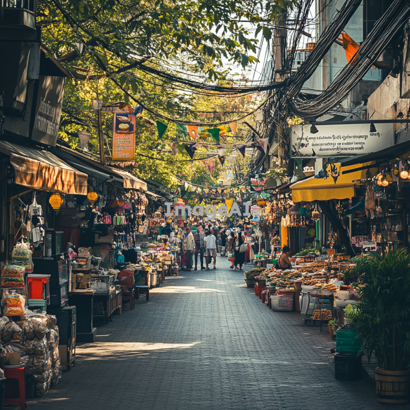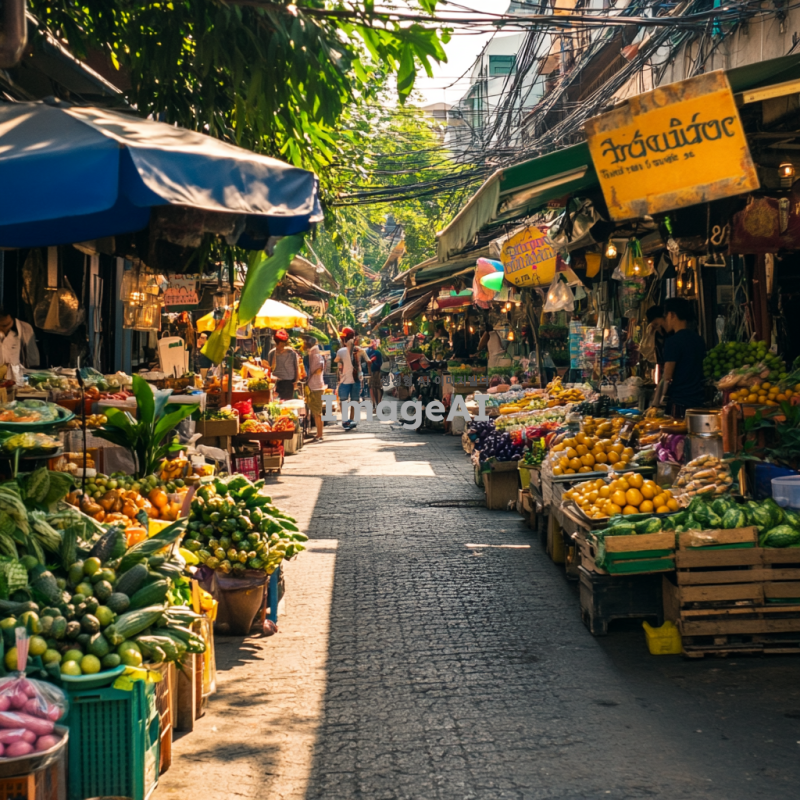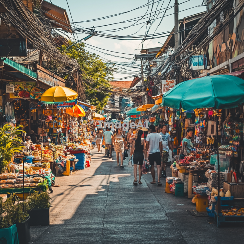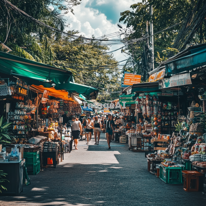 태국의 전통 시장이 있는 활기찬 거리 풍경, 다양한 색상의 노점상과 사람들로 가득 찬 장면, 열대 식물과 화려한 간판이 어우러진 모습, 따뜻한 햇살 아래 생동감 넘치는 분위기, 거리의 음식과 문화가 잘 드러나는 장면.